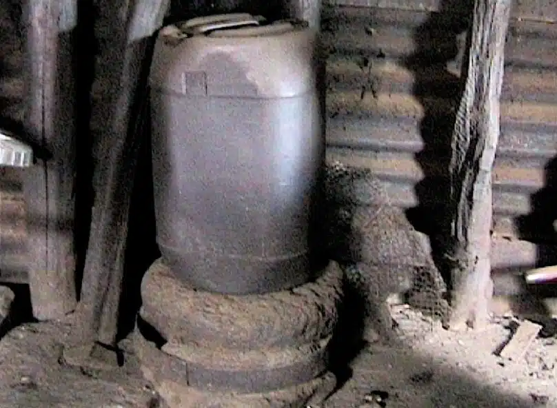 Ben, ça c’est le bidon pour conserver la semence… la semence de maïs pour planter. Quand il a fini de sécher, on le plante. De même, quand (les épis sont) secs, j’en remets dans le bidon… J’ajoute un petit peu de pétrole, un petit peu d’essence dedans, pour conserver le grain… pour conserver la semence… au moins elle n’est pas piquée. Parce que si on la laisse dehors longtemps comme ça, le petit… comme un genre de petit papillon… comme une petite chenille dedans… il vient piquer le maïs.