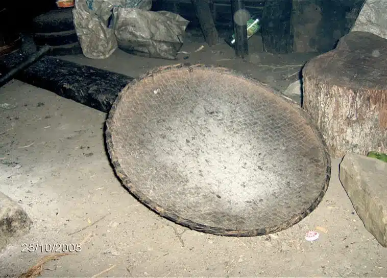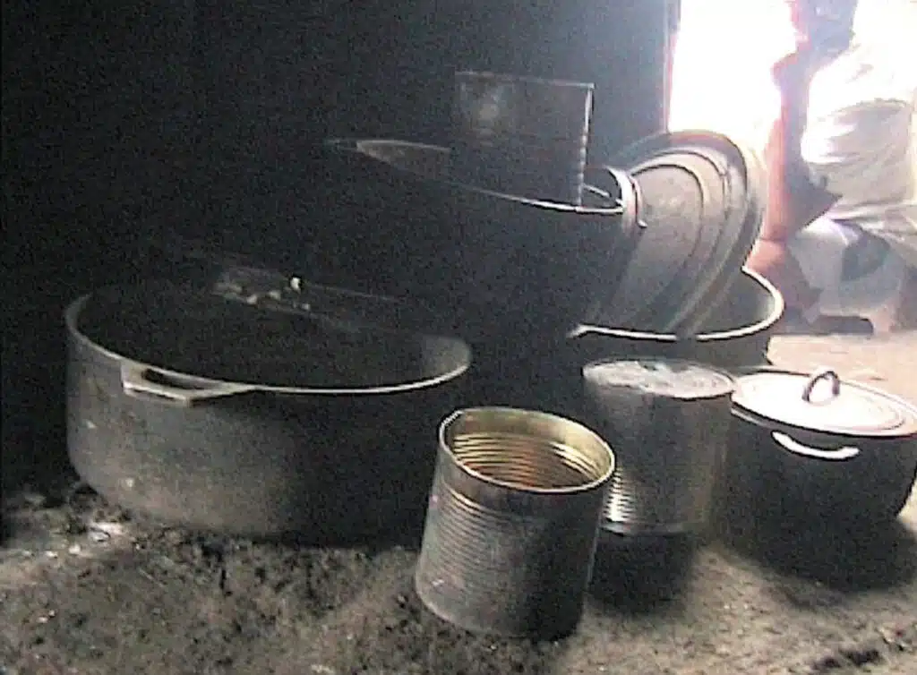Dans les cuisines en paille, « on peut pas faire de cheminée », parce qu’il faudrait faire un trou et quand la pluie tombe, ça coule … Tandis qu’il faut une maison spéciale pour construire une cheminée. Si on a une maison en tôle, on construit une cheminée sur le côté, mais dans la cuisine en paille, on ne peut pas… Il faut une cuisine spéciale, ou bien une cuisine en tôle… parce que si tu perces un trou dans la cuisine en paille, ça sert à rien, quand la pluie tombe, ça coule… » … « …Dans la cuisine en paille, on peut pas construire de cheminée… On a toujours boucané comme ça. Personne ne nous a coupé de… Nous, on fait comme nos parents nous ont élevés. Nos parents nous ont élevés dans la cuisine en paille, dans la fumée. Hé bien nous, on ont fait la même chose comme ça tout seuls, pour suivre la tradition des parents… comme tout le monde, n’est-ce pas ! »