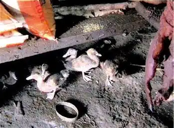 Parce que quand ils sont petits, on est obligé de les mettre ici dedans pour les faire grandir, parce que les gros, ils tapent les petits… Mais quand ils sont un peu plus forts, eh bien je les mets dehors… Parce que les gros, ils en profitent, ils sont encore trop tendres. Parfois je les mets comme ça, je les laisse quelque temps dans la cuisine et après je les sors… parce que les gros ils assomment, ils frappent les petits, et après parfois ils les tuent… hein… Mais ensuite là, quand ils sont un peu plus costauds, je les mets dehors… »