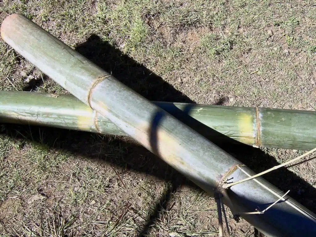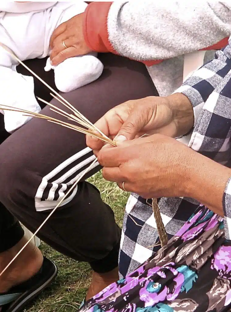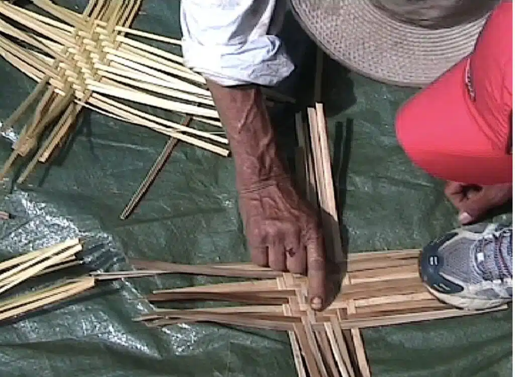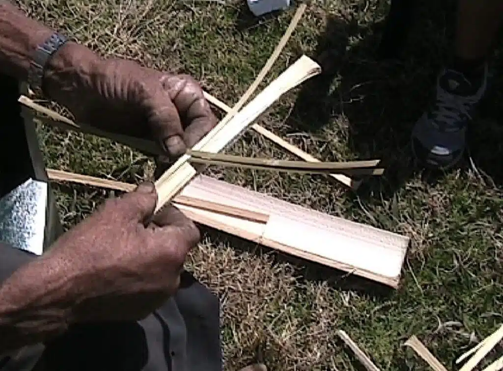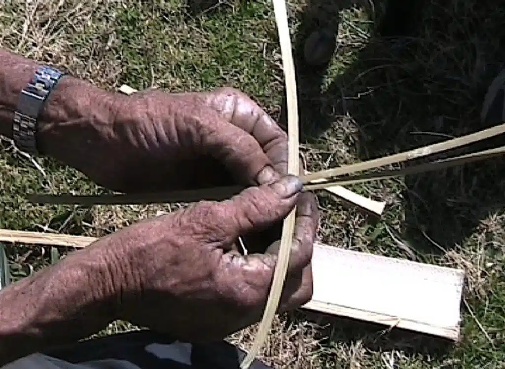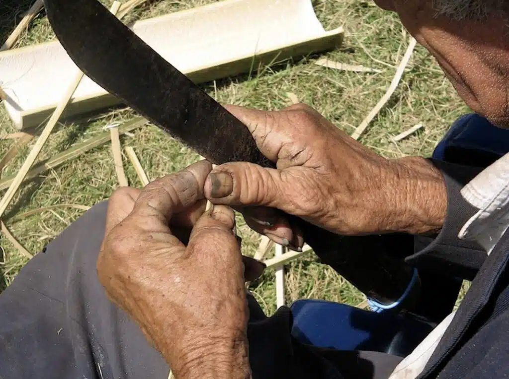 – Michel le travaille avec son sabre à canne et en sépare les fibres, de façon à en sortir les brins qui serviront au tissage.