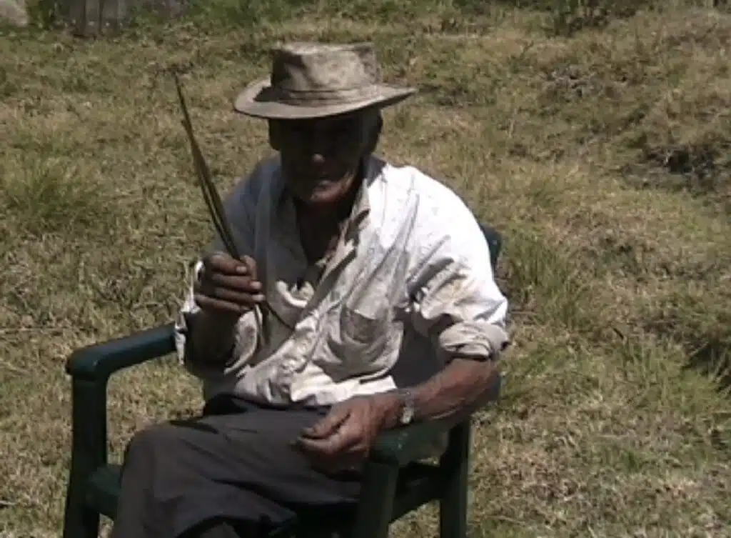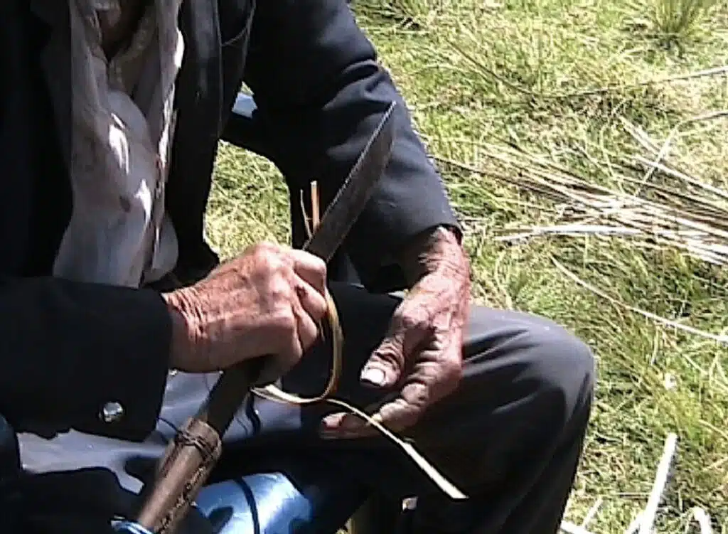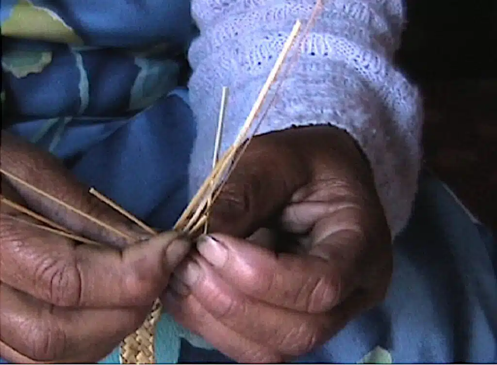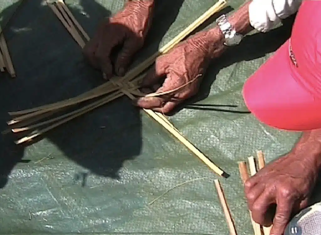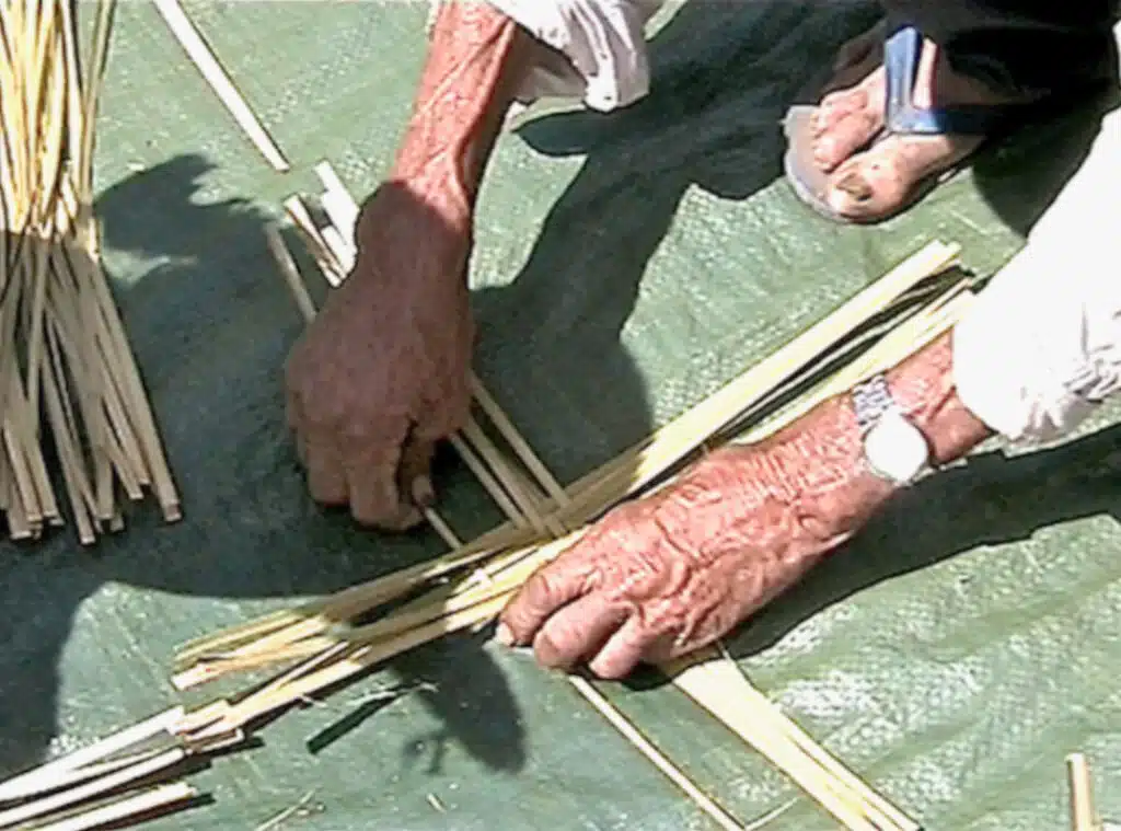 Ici, à son âge, il est encore sollicité pour le tressage des vann’, et la fabrication de pilons et de moulins à maïs. Il n’a encore jamais tissé de tente ou de bertel ! Il préfère ne pas s’y attaquer ! En revanche, il fabrique également des chapeaux, parce que, dit-il « c’est plus facile ! ».