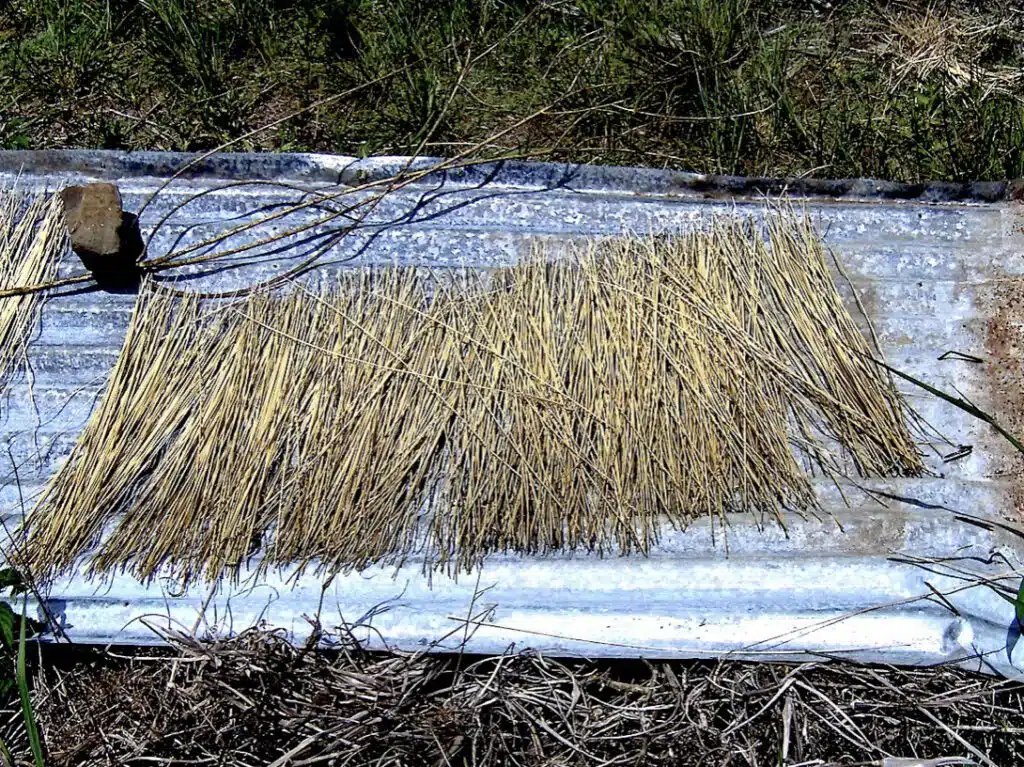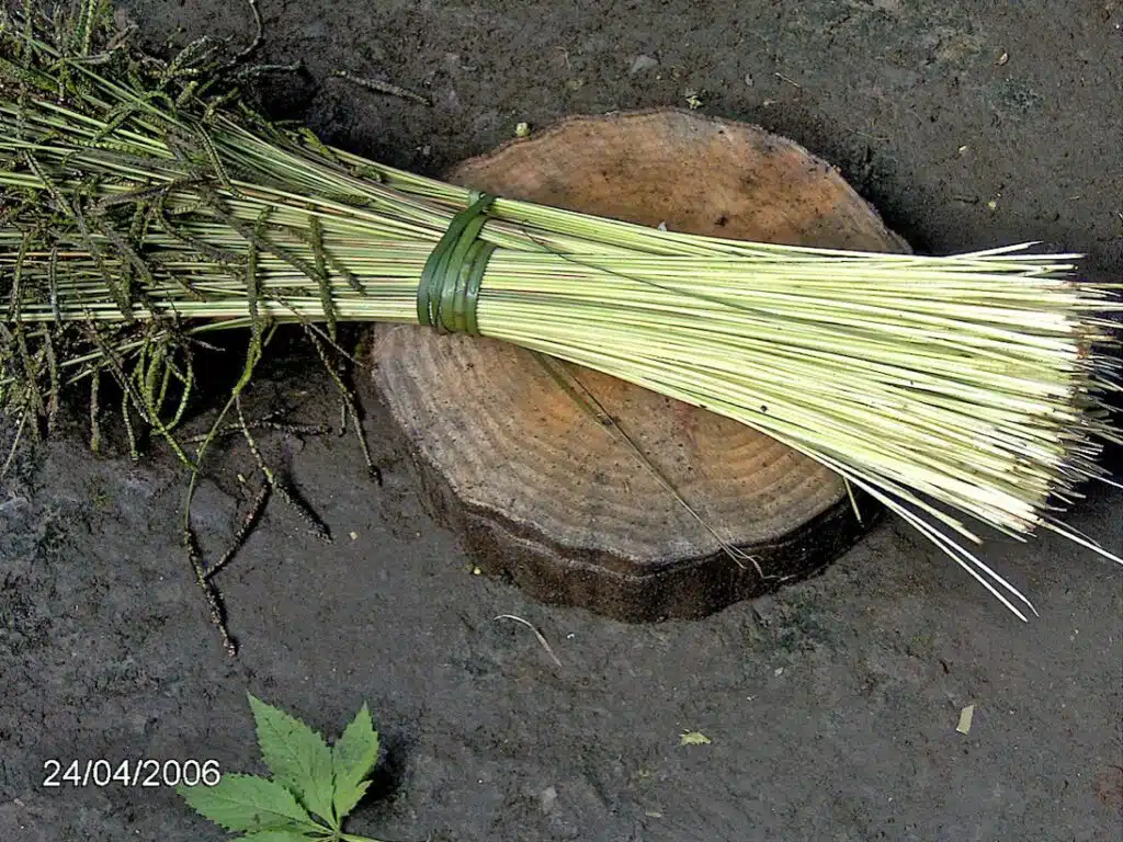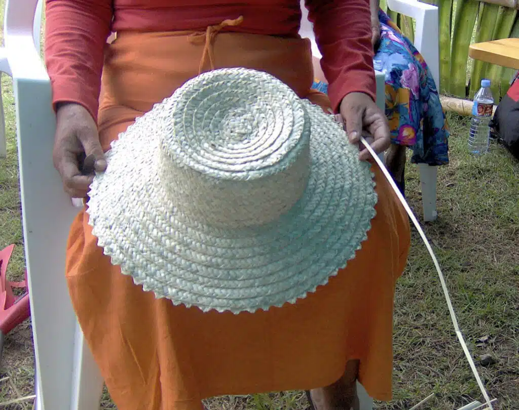 • Les capelines d’Antoinette Cernot sont confectionnées avec des nik de chiendent. Ici, on appelle nik, les tiges des plantes. Le chiendent d’Antoinette est sans doute un Sporolobus africanus (Poaceae), avec des feuilles engainantes, des fleurs sur un très long épi, des tiges solides et de petites graines vert foncé.