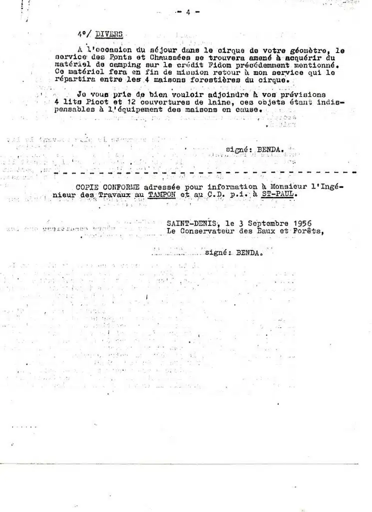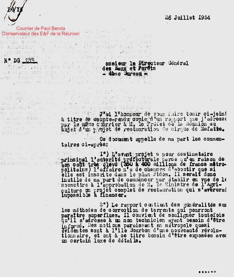 Le 26 juillet 1954, le Conservateur des Eaux et Forêts de la Réunion, M. Paul Benda, adresse à son Directeur Général à Paris un projet de restauration du cirque de Mafate estimé entre 350 et 400 millions de Francs métropolitains, montant dont il espère qu’il sera financé par le FIDOM !