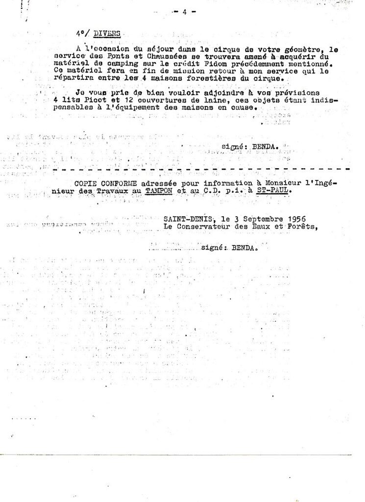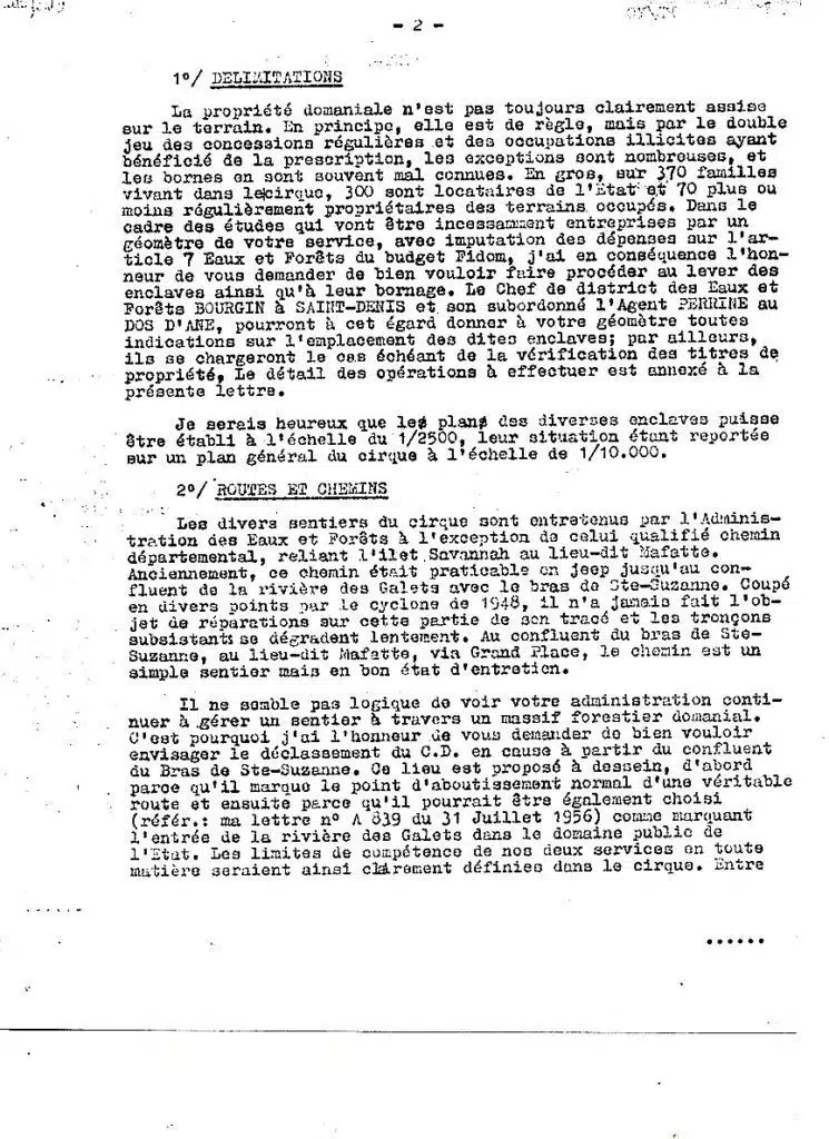 NB – L’époque est à la récupération, par les Domaines, de l’ensemble du territoire du cirque, par achat ou par expropriation. De ce point de vue, il est intéressant d’observer qu’en 1956, le cirque comporte encore un certain nombre d’îlets habités privés, désignés ici en tant qu’enclaves non domaniales… D’où les opérations de bornage énumérées dans le document. Evidemment cette situation ne durera pas. On expropriera à tour de bras… A la fin de la seconde moitié du siècle, il ne restera à Mafate que deux ou trois « espaces privés », dont la propriété Pausé à Grand-Place, sur laquelle était bâtie la première école.