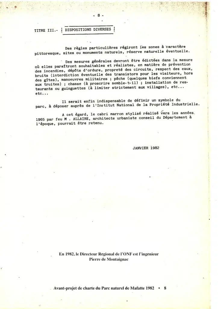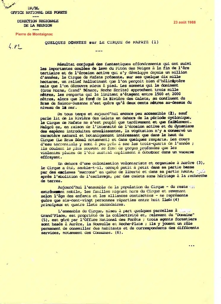 Ce document, intitulé « Quelques données sur le cirque de Mafate », a été rédigé alors que P. de Montaignac était encore directeur régional de l’ONF, jusqu’en 1989, lui qui fut par ailleurs l’initiateur du Premier Colloque de Mafate en mai 1983. Mais contrairement à l’ « Avant projet de Charte du Parc naturel de Mafate » daté de 1982 et bien que son nom y soit inscrit en rouge, ses descriptions approximatives ou incomplètes me font douter sérieusement qu’il en ait eu lui-même connaissance…