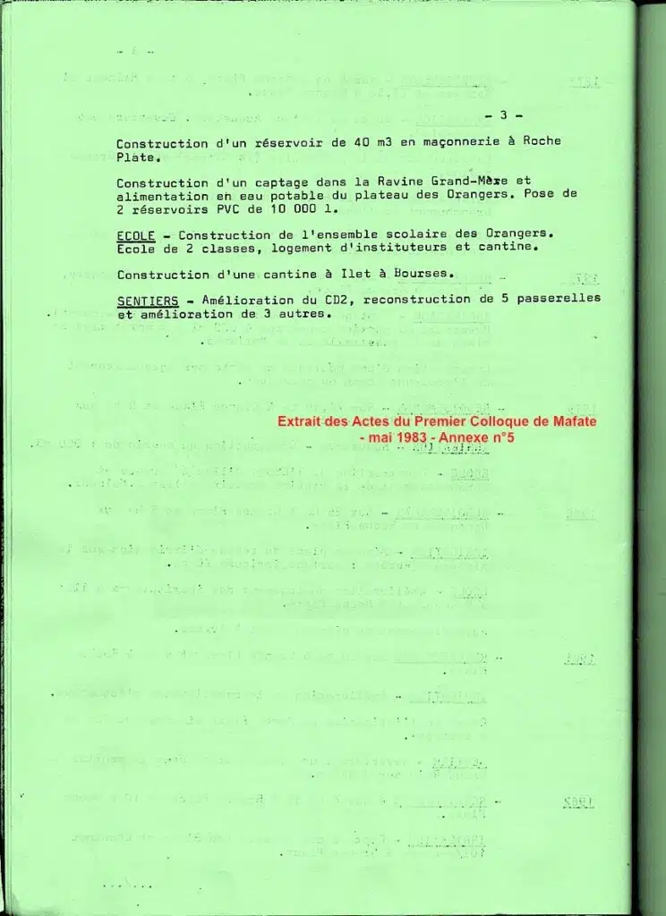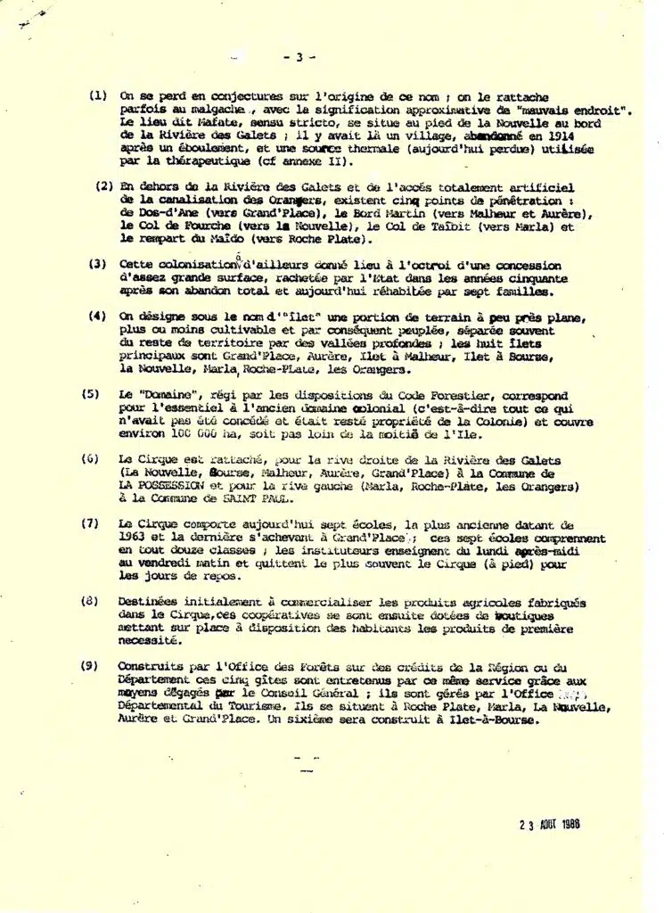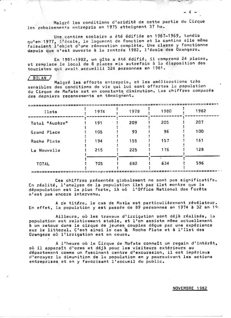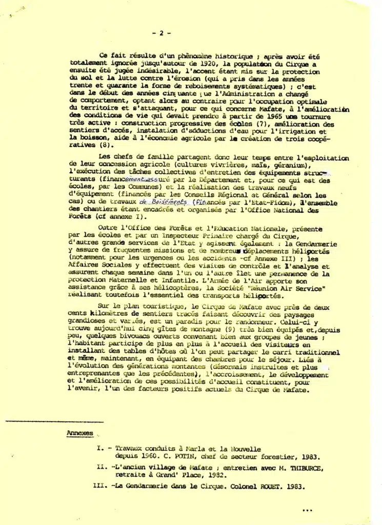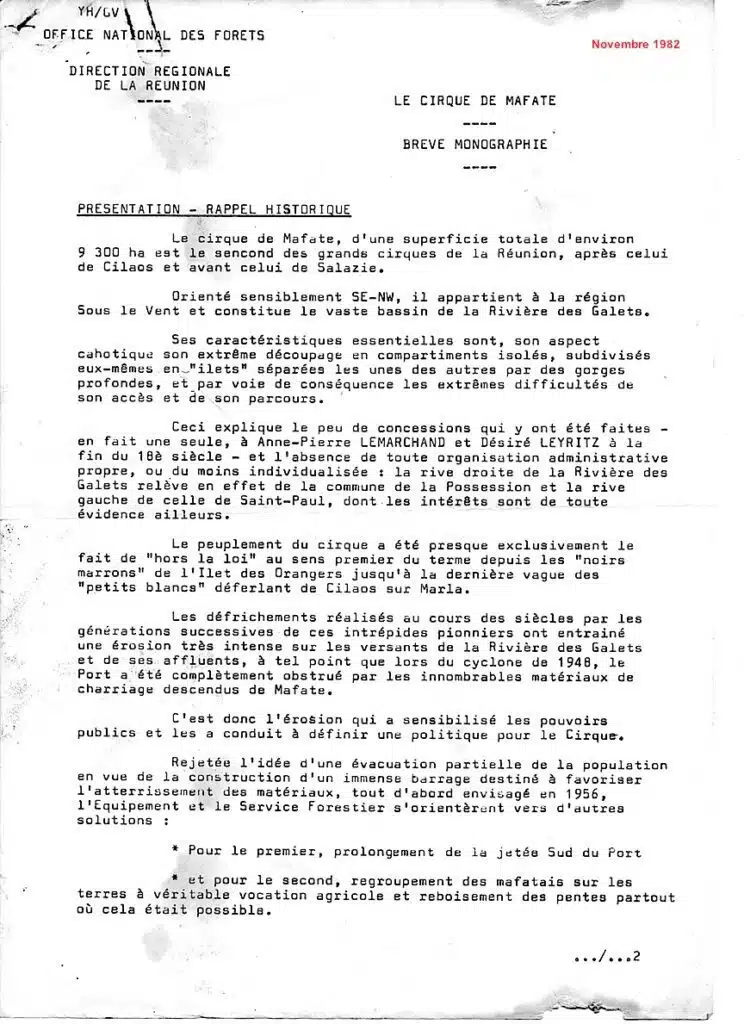 On a retenu cette « Brève monographie », source de renseignements d’une incontestable utilité. Quoique très succinct, il s’agit un document bien informé sur la situation du cirque à cette époque, et contribution probable à la préparation de l’expédition des autorités publiques dans le cirque en mai 1983, connue sous l’intitulé du « Premier colloque de Mafate« .