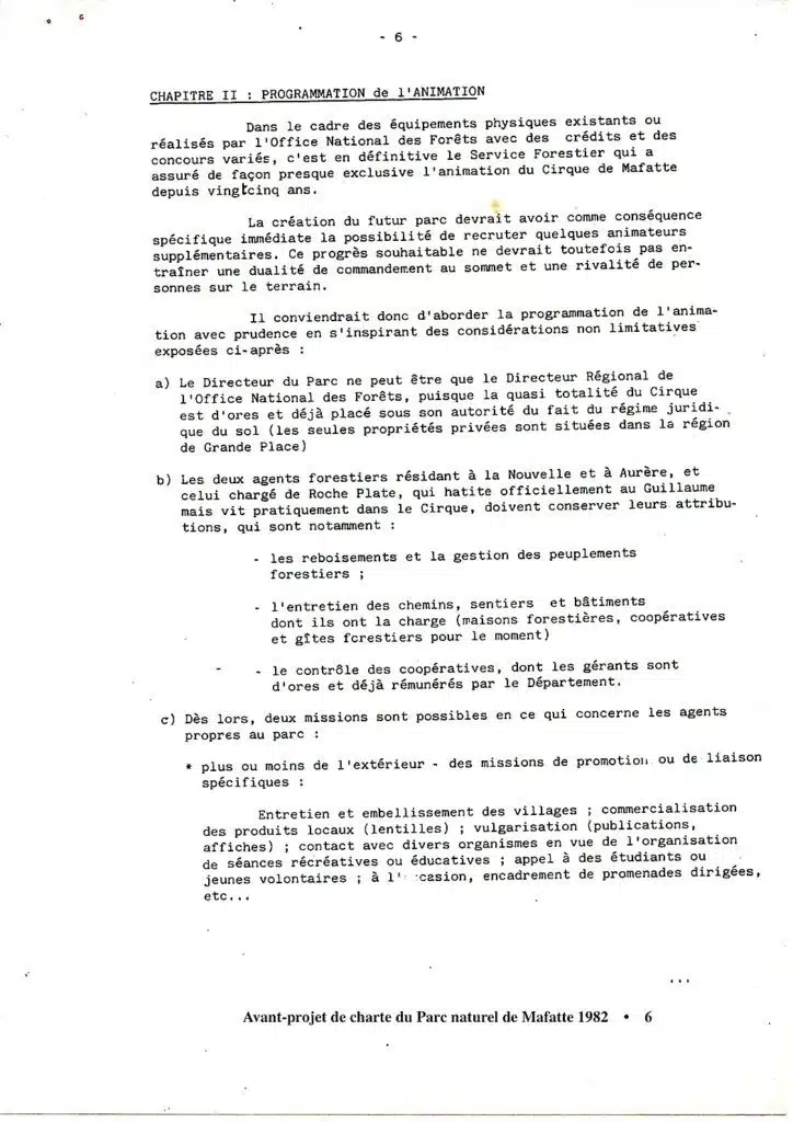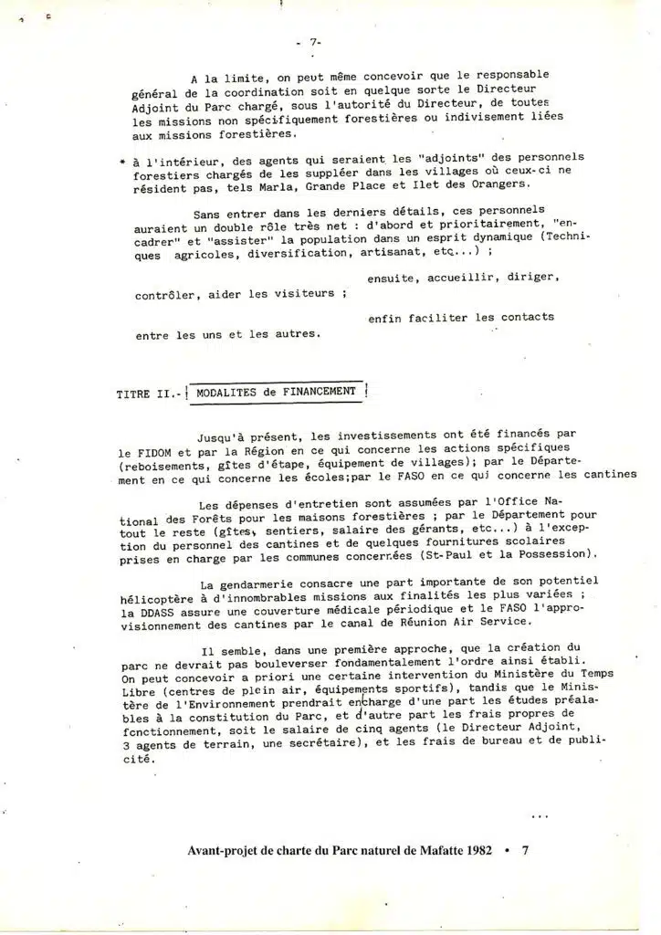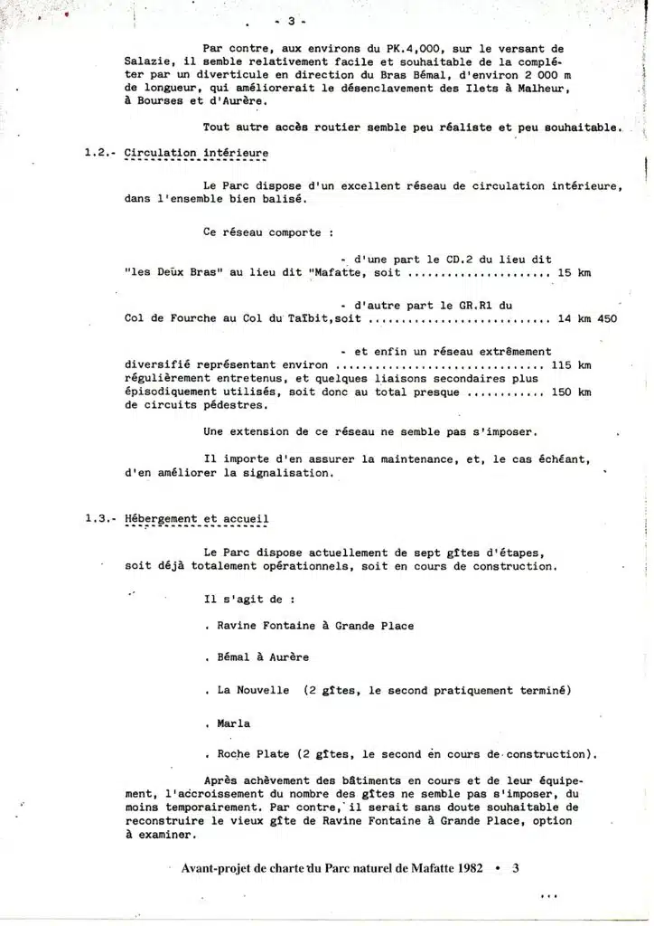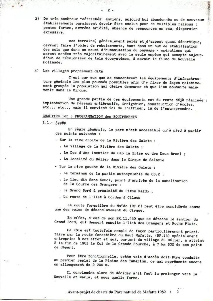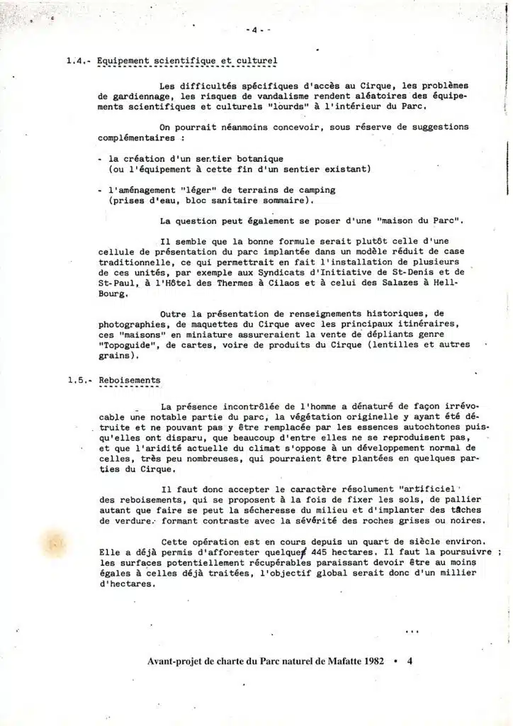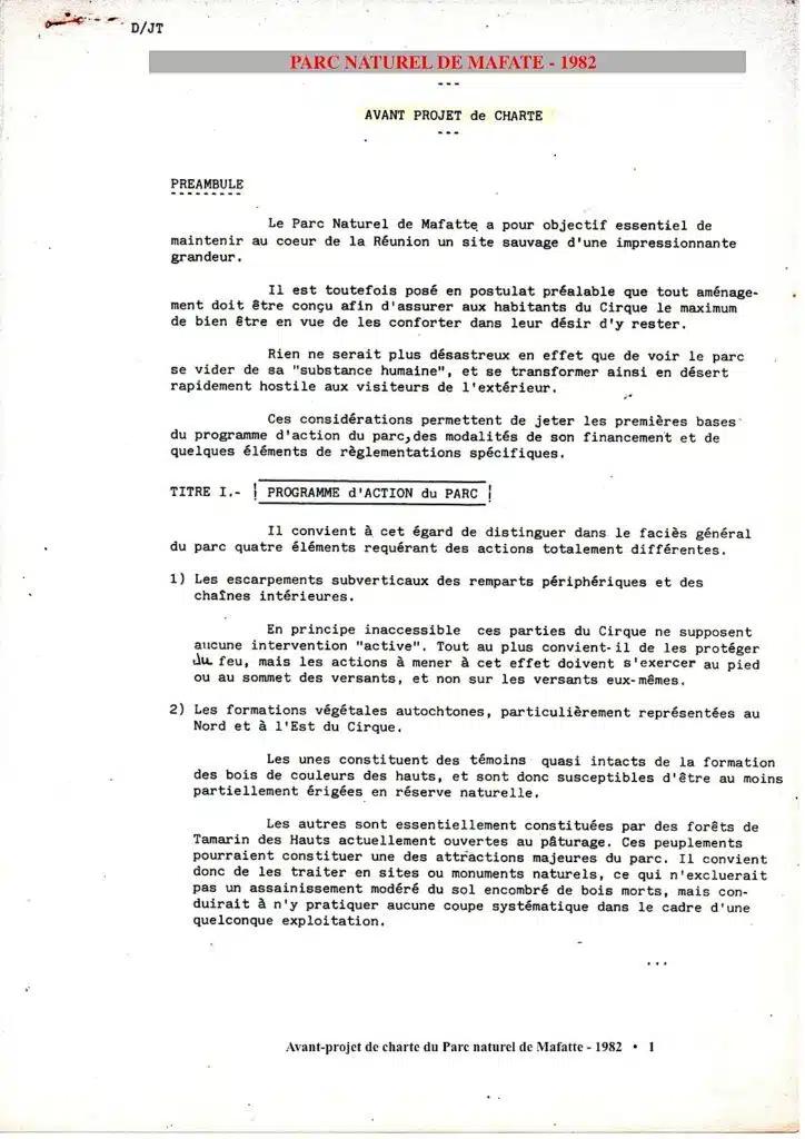 « … car le monde et les temps changent… ». En janvier 1982, alors que Pierre de Montaignac est le Directeur régional de l’ONF, est élaboré un « Avant projet de Charte du Parc naturel de Mafate » ! (Les références en en-tête « D/TJ » sont insuffisantes pour l’identification de l’auteur de la rédaction… Dommage !). De plus, on peut légitimement penser qu’il ne s’agit que d’une ébauche, interrompue bien avant d’avoir atteint le cœur de son objet. L’intérêt de la démarche demeure cependant. Elle rappelle que depuis au moins trente ans les projets globaux, amalgamant aménagements structurants et problèmes de développement humain se sont succédé avec plus ou moins de réussite. Et qu’il semble toujours plus aisé de réaliser les premiers que d’assurer le second.