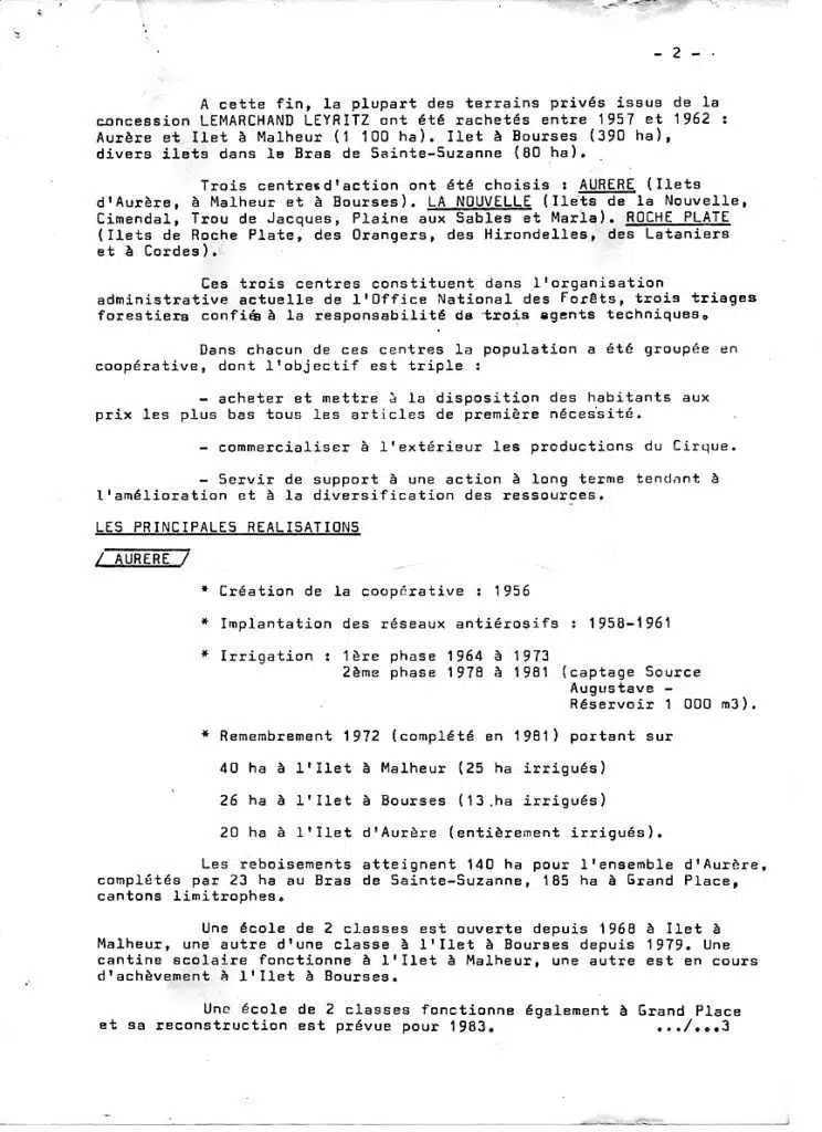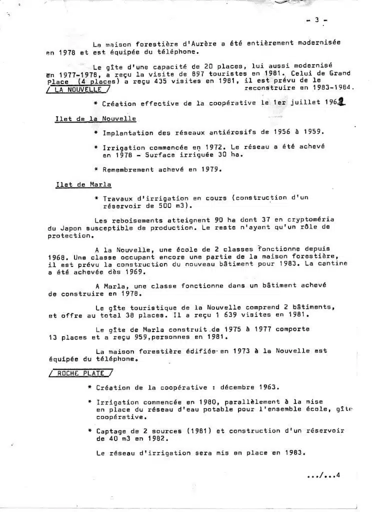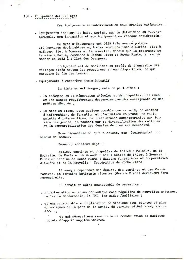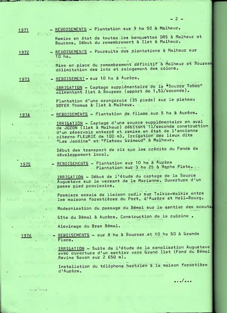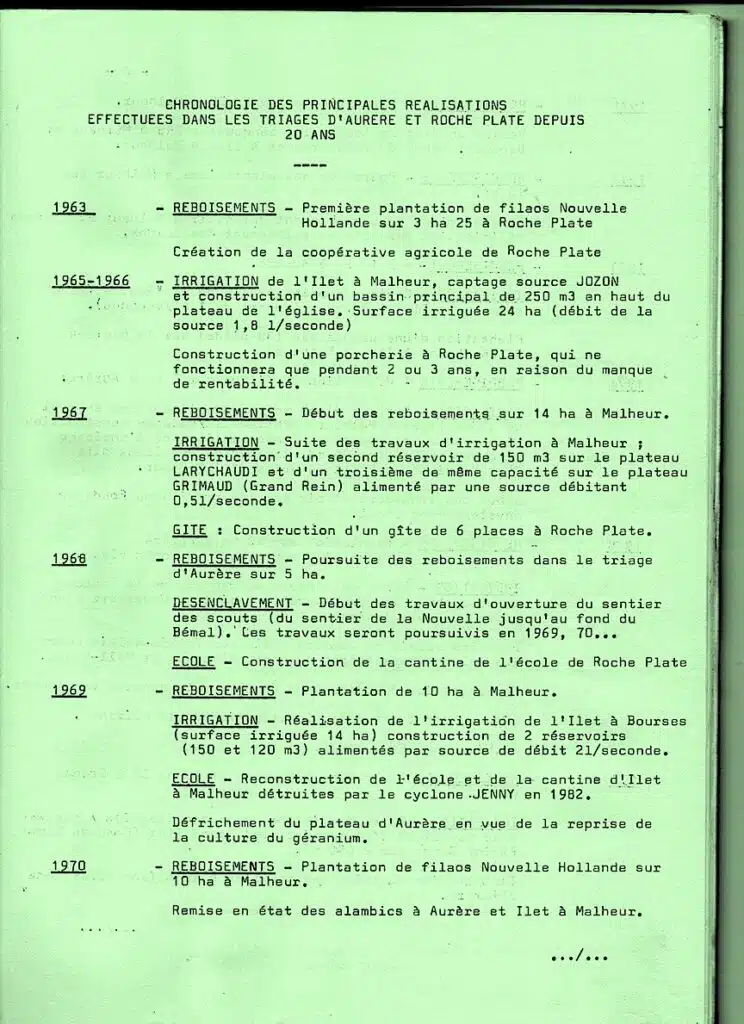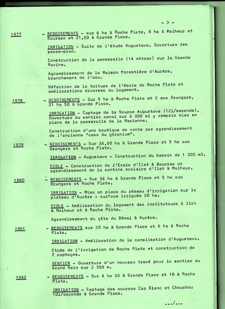 C’est ainsi que, depuis plus de trente ans, si les reboisements de protection (notamment en filao) se sont poursuivis avec ténacité, les habitants des îlets ont pris part petit à petit à des travaux de plus en plus diversifiés : réfection et entretien des sentiers de circulation et des ouvrages d’art utiles ; mise en valeur des terrains cultivables et construction de banquettes permettant les cultures sarclées sans provoquer d’érosion ; création des coopératives de vente et d‘achat des denrées agricoles ; construction de réseaux d’adduction d’eau potable et d‘irrigation ; édification successive des écoles nécessaires dans tous les îlets, depuis Roche Plate en 1962 jusqu’à Grand Place programmé en 1984; construction simultanée des autres équipements utiles : locaux des coopératives, logements des enseignants, cantines, etc…