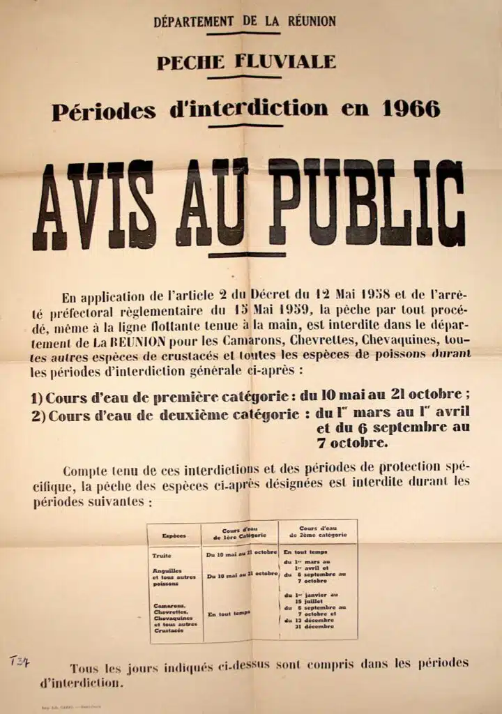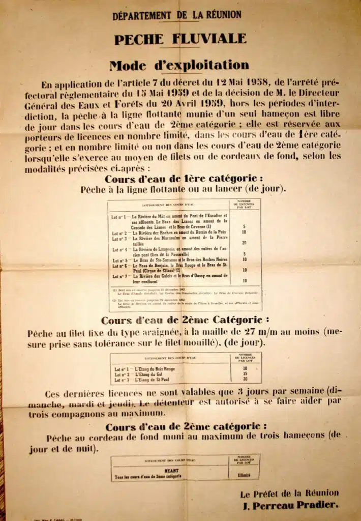 De façon anecdotique, j’ai retrouvé de cette période des années 60 des affiches relatives à la réglementation de la pêche fluviale. En amont de leur confluent, la rivière des Galets et le Bras d’Oussy font partie des cours d’eau de 1ère catégorie, lot n°7.