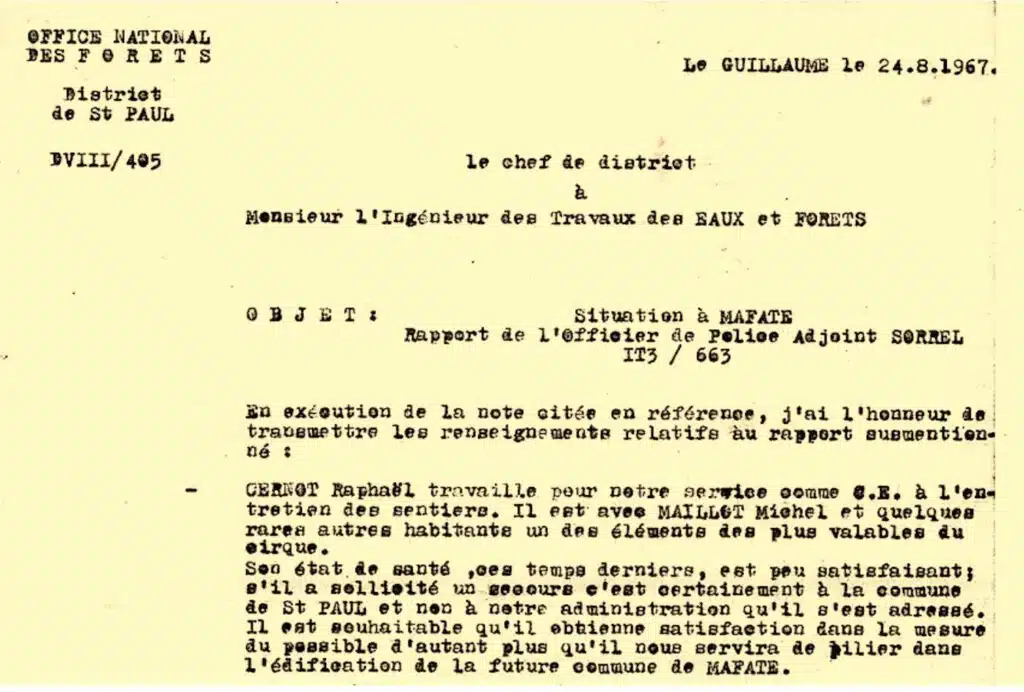 • Surprenant : Il semble bien que le premier projet d’une « Commune de Mafate » date de cette époque. Extrait d’un courrier du chef de district de l’ONF de Saint-Paul à l’Ingénieur des Travaux E&F, daté du 24 août 1967. Il fait suite à une enquête de la Sûreté à propos d’un habitant, M. Raphaël Cernot, personnalité importante des Orangers :