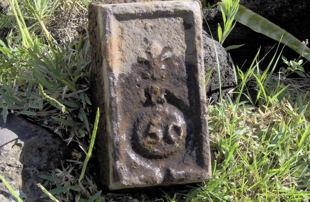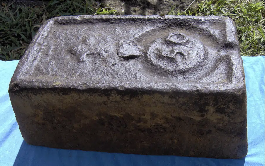 En relief : Une fleur de lys sculpté, ainsi qu’une inscription : 50 et le logement pour un anneau de levage (Système de levage cassé, pas d’anneau…) Il s’agit sans doute de « livres ». On ne trouve plus aucune autre marque visible.