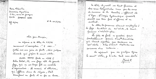 J’ai fait reproduire le courrier manuscrit de Marie Kabouche qui permet de situer l’origine de cette pièce de fonte, sinon son usage.