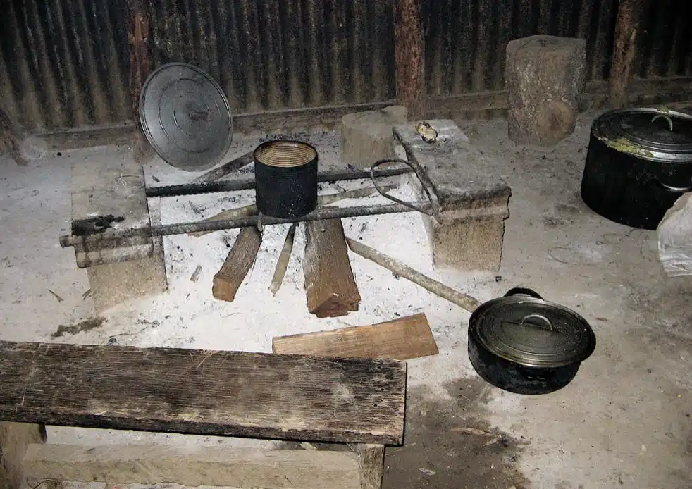 Le feu est ouvert, les marmites sont posées sur deux barres de fer forgé, engagées dans deux parpaings.