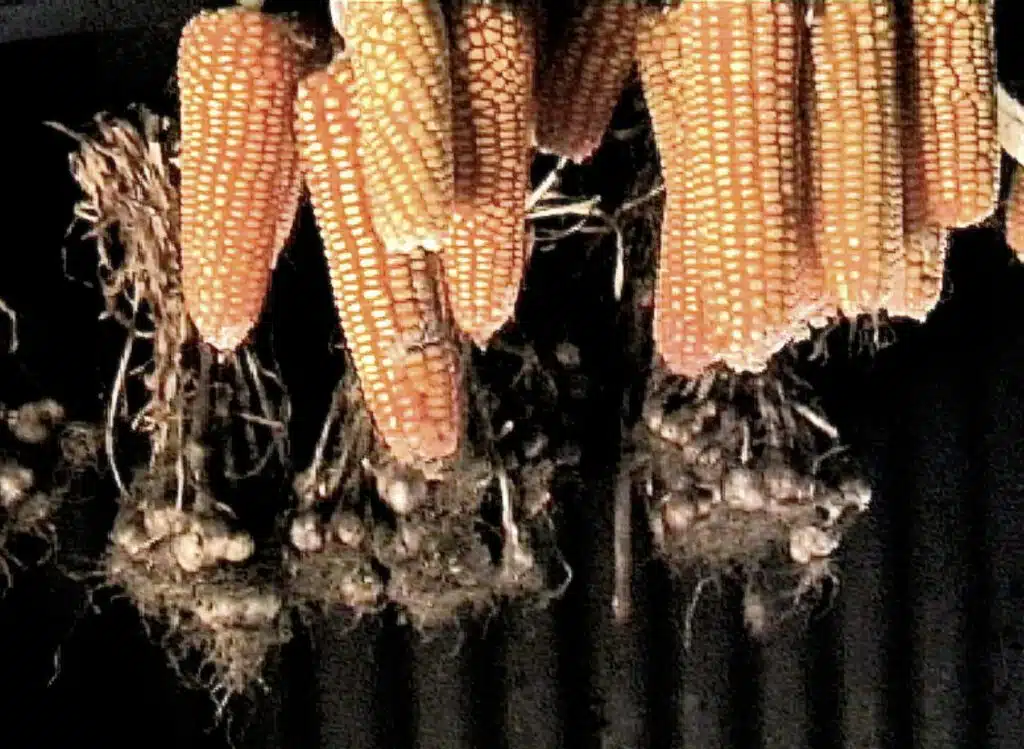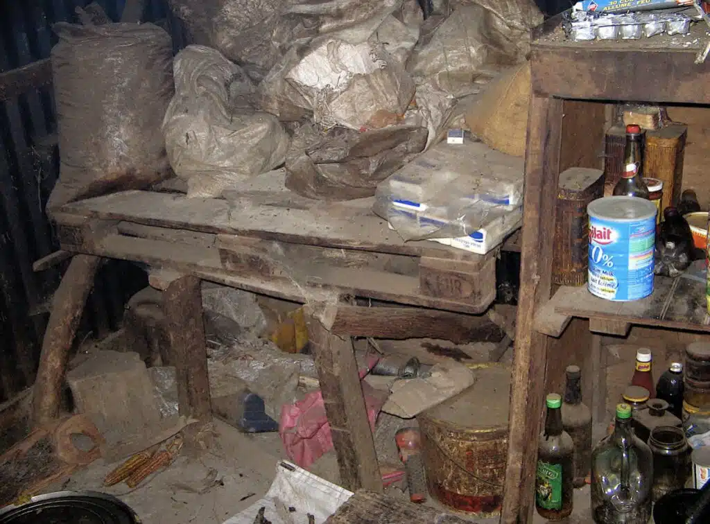 Au bout du cadre deux récipients hermétiques renferment la semence de maïs attendant la saison. Entre la porte du pignon et le cadre, posé sur un tronc, le moulin maï qu’utilise régulièrement Lucile. À côté, la réserve de gaz et divers ustensiles.