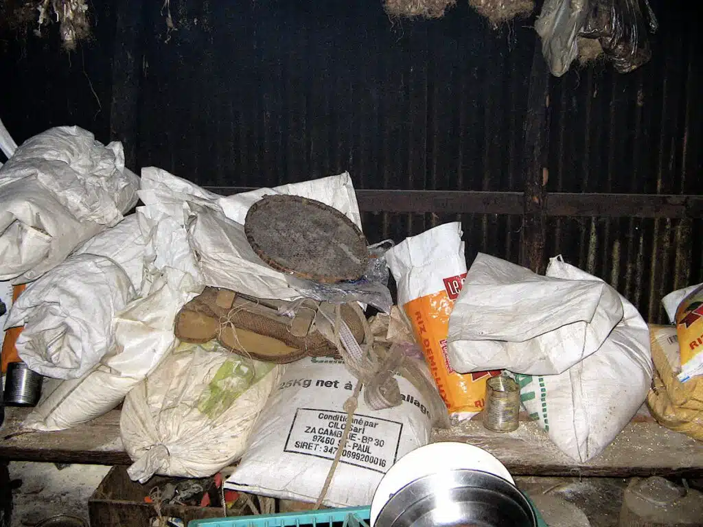 Sur le cadre de la paroi d’en face posé sur des troncs de filaos, on trouve des goni de grain, de riz, le « manzé zanimo« , le maïs cassé, la farine. La vann est posée là, mais également le pano bef que Loïc, l’un des enfants adolescents a rangé.