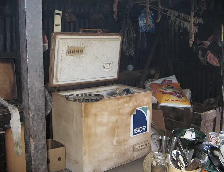 Et de l’autre côté de la porte, la caisse à outil en bois, ainsi qu’un congélateur usagé jouxtant la gazinière, qui sert de coffre de rangement au milieu de la case :