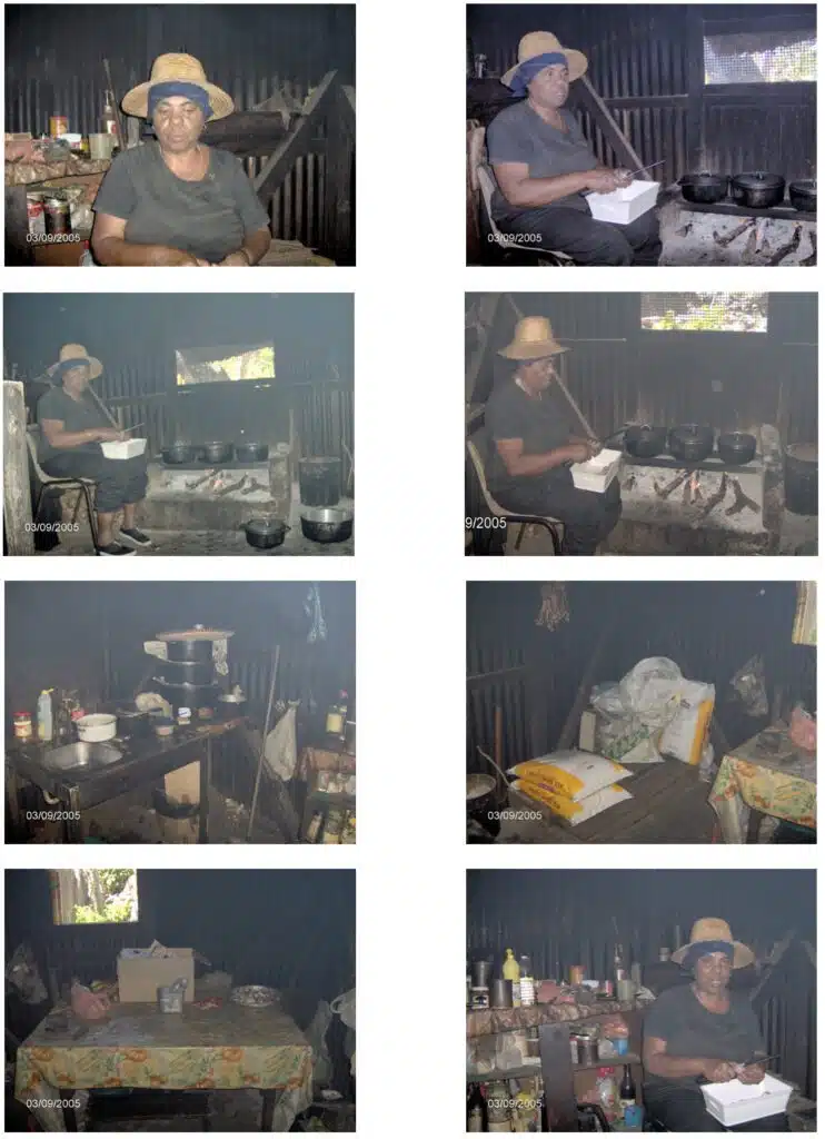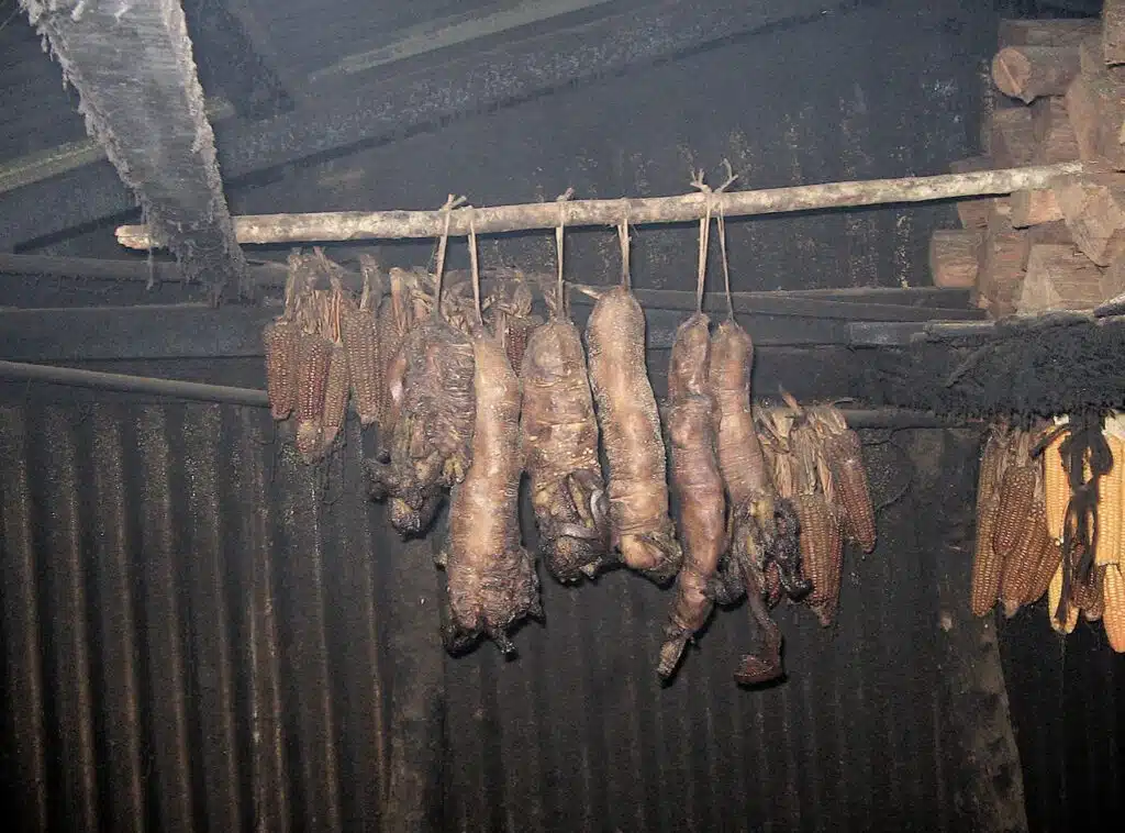 Le toit de la cuisine de Lucile constitue une incroyable réserve de nourriture suspendue et, selon la tradition, préservée par un boucanage qui dure plusieurs semaines, voire plusieurs mois, grâce à la fumée du foyer allumé pratiquement en permanence.
