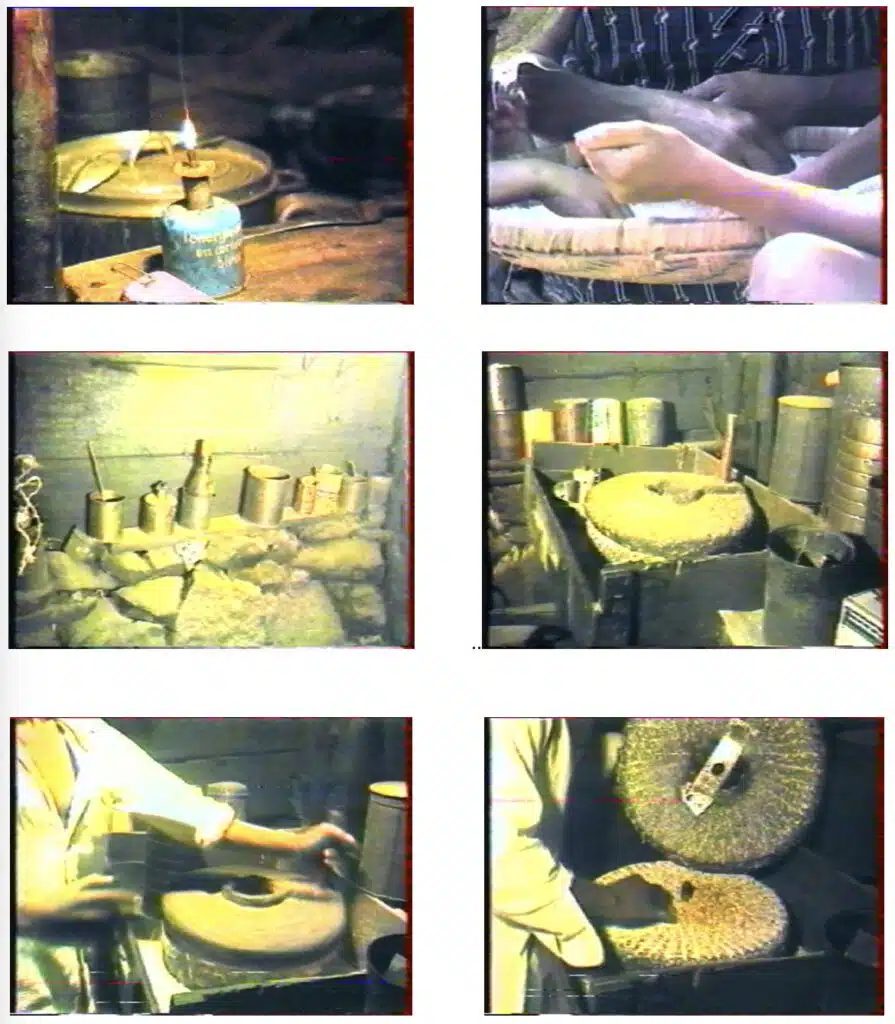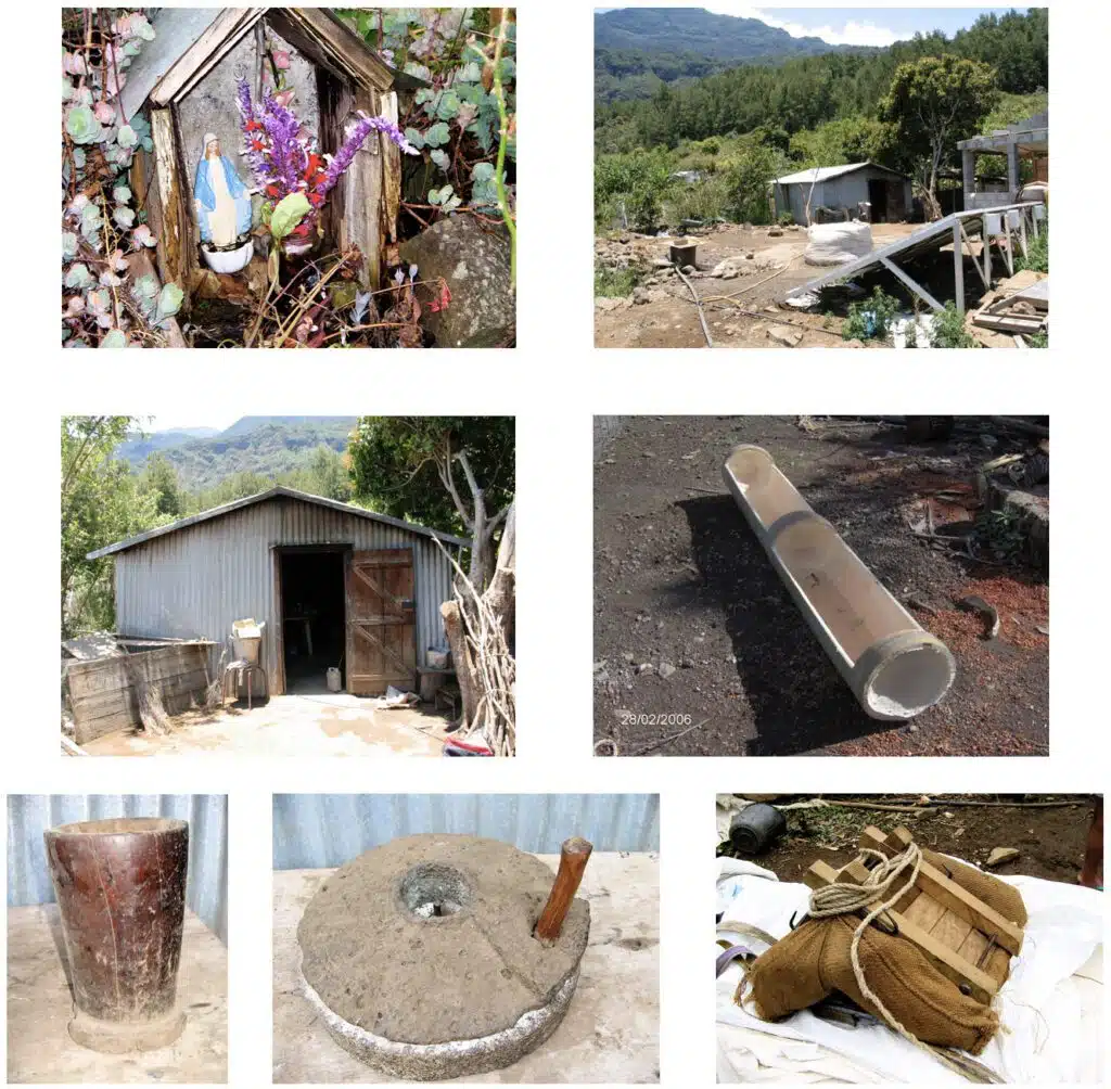 Marmites en fonte, nombreuses moques en tôle, kalumé (tangol tamoul) pour entretenir le feu, moulin maï et van… Bec de gaz pour y voir clair… Le buffet – commode de fabrication familiale qui abrite des ingrédients. Le moulin à maïs de la famille de Philippe THIBURCE d’îlet Moutou en 1986. Installé à hauteur d’homme, dans sa caisse qui permet une récupération aisée de la mouture.