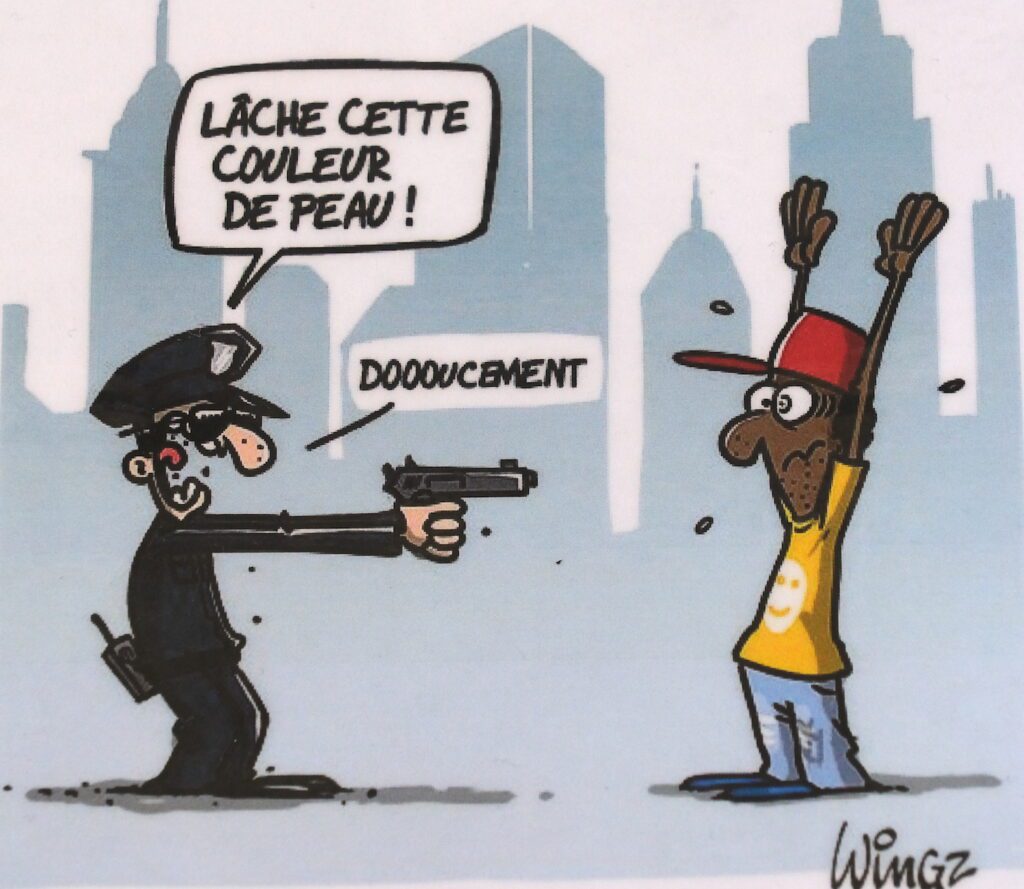Des dessins humoristiques émaillent l’exposition de messages plus ou moins pertinents. C’est quand même amusant de voir le racisme policier dénoncé dans les écoles de la République.