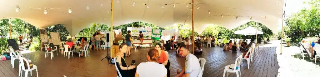 Les manguiers protègent les participants de la chaleur écrasante, alors que les médias indiquent que la tempête Faïda s’approche des côtes de la Réunion. Sous le chapiteau, une soixantaine de personnes en cercle écoutent attentivement le déroulé de la journée. Ce samedi 1er février marque le premier festival de la gouvernance partagée organisé par l’association Le Clan. Au Verger de Mahavel à la Ravine-des-Cabris, c’est une belle réunion d’acteurs de la transition qui s’annonce. Dans l’assemblée, déjà beaucoup de têtes me sont connues.