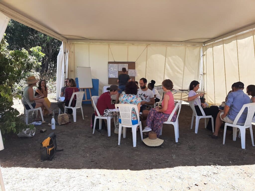 Les manguiers protègent les participants de la chaleur écrasante, alors que les médias indiquent que la tempête Faïda s’approche des côtes de la Réunion. Sous le chapiteau, une soixantaine de personnes en cercle écoutent attentivement le déroulé de la journée. Ce samedi 1er février marque le premier festival de la gouvernance partagée organisé par l’association Le Clan. Au Verger de Mahavel à la Ravine-des-Cabris, c’est une belle réunion d’acteurs de la transition qui s’annonce. Dans l’assemblée, déjà beaucoup de têtes me sont connues.