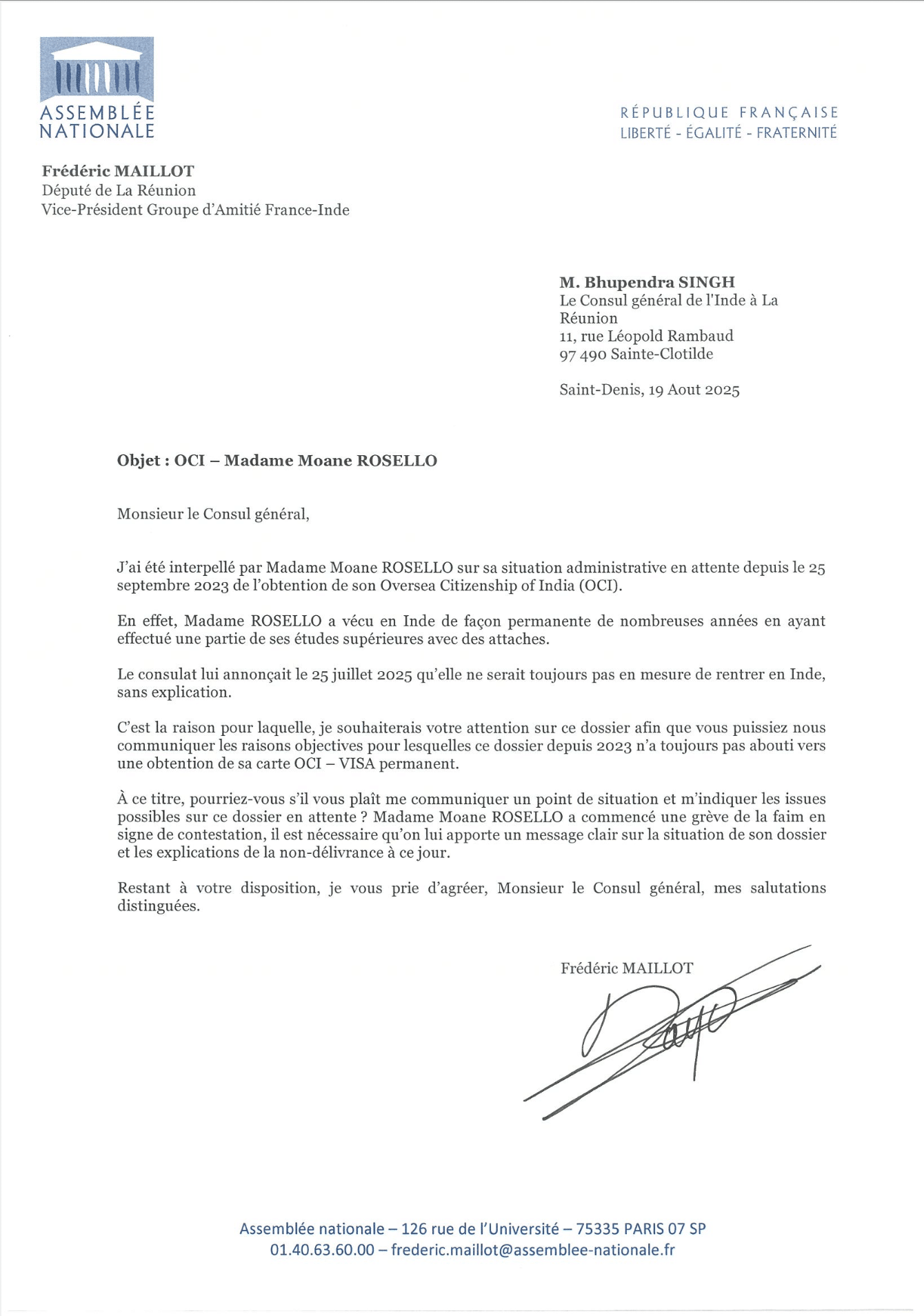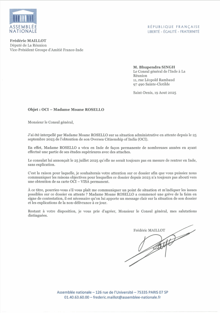 Le député Frédéric Maillot a aussi apporté son soutien à Moane Rosello, en envoyant une lettre au Consul général de l’Inde à La Réunion. Celui-ci lui aurait répondu que le blocage venait en effet de l’Inde et que la justification résiderait dans le fait que Moane Rosello manquait d’un justificatif administratif à sa présence dans le pays depuis trois ans. De fait, elle aurait été considérée comme en présence irrégulière sur le territoire. Pour autant, le député compte continuer d’interpeller ses interlocuteurs indiens. « Moi, je vais pas m’arrêter là. Je suis vice-président du groupe France Amitié France-Inde, donc dès la reprise, je vais essayer de décanter ça. »