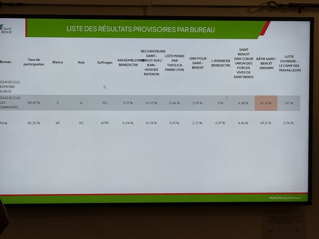 Du côté de Saint-Benoît, c’est aussi le maire sortant, Patrice Selly, qui repart pour 6 ans. À la mairie en centre-ville, les résultats des dépouillements étaient peu à peu projetés sur le mur pour suivre en direct le dénouement des élections. Le premier résultat était celui du bureau numéro 42 de l’école des Orangers à Saint-Anne, qui donnait déjà Patrice Selly vainqueur à 67,76 %.