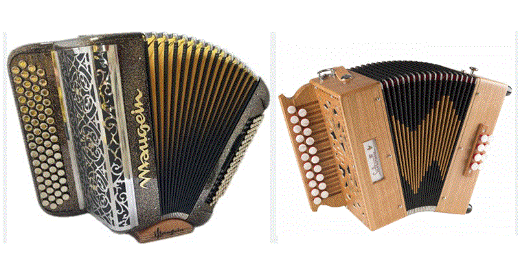 Il existe deux types d’accordéons : l’accordéon chromatique et l’accordéon diatonique. Le premier émet le même son lorsqu’on tire et lorsqu’on pousse. Il peut avoir côté main droite des touches « bouton » ou des touches « piano ». Par contre, l’accordéon diatonique, très en vogue notamment à Rodrigues et en Amérique du Sud (tango) émet un son différent selon que l’on tire le soufflet ou qu’on le pousse. Il est donc de plus petite taille. L’accordina est un petit instrument fabriqué comme un accordéon (boutons « main droite », mais dans lequel on souffle avec la bouche).