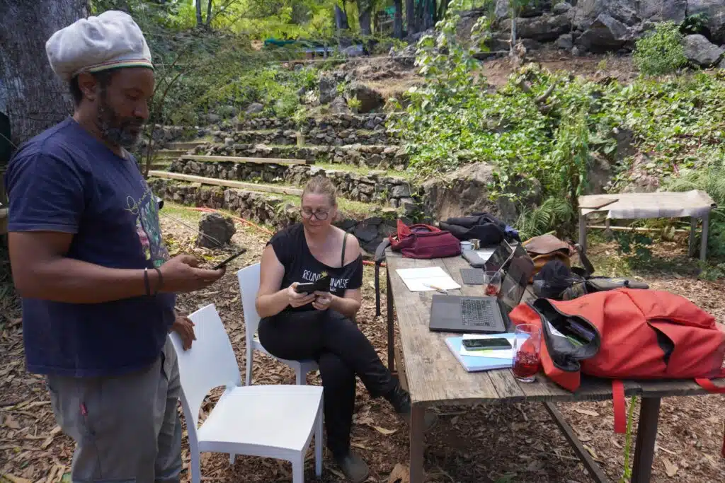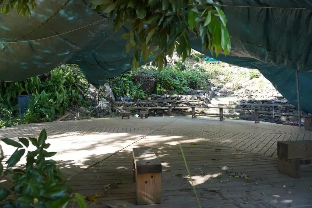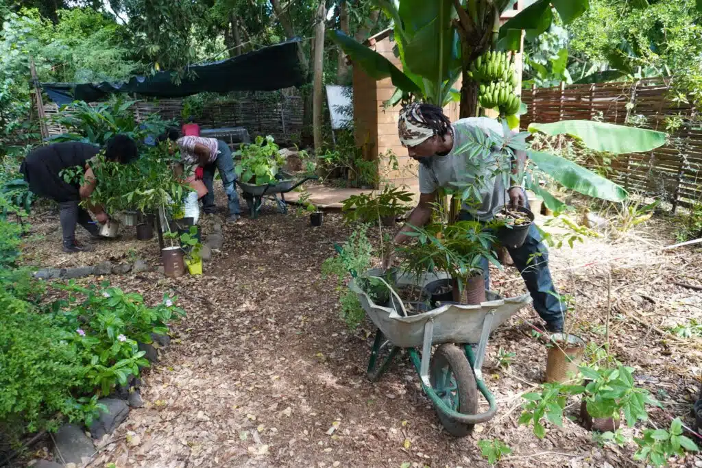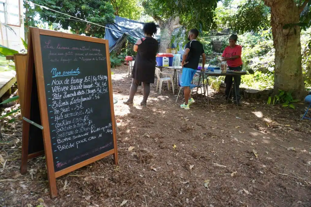 En deux ans, le noyau dur du projet, et la douzaine de salariés en insertion qui ont intégré l’association dès janvier 2022 grâce à des financements publics, sont parvenus à défricher, planter, et mettre en état d’utilisation optimale 7000m2. Les parcelles centrales, renommées « ronkozé », « les feuilles », ou encore « sakalava », ont vu s’ériger un grand boukan, une petite boutique pour vendre les produits transformés ainsi qu’une scène couverte et ses gradins de pierres et de bois.