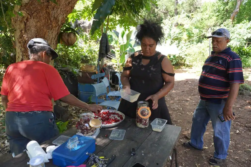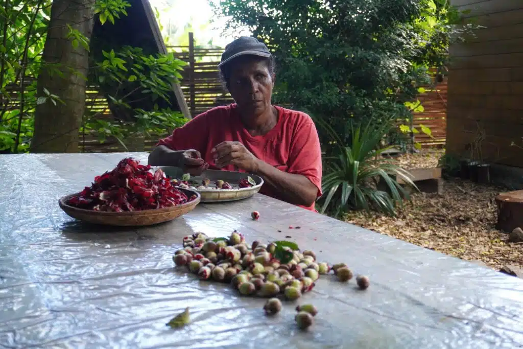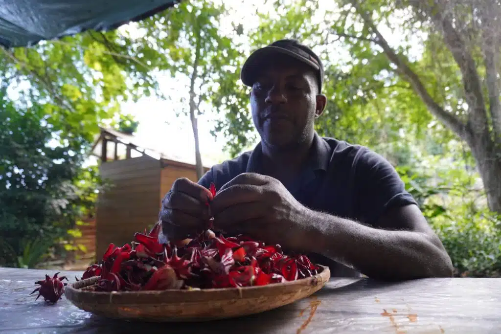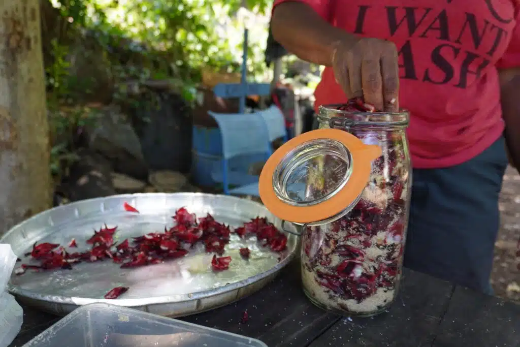 Assis à l’abri du soleil, non loin de l’entrée des Jardins, quatre salariés en insertion sont à la tâche. Armanda et Christophe séparent les fleurs de la graine de bissap. Elles seront ensuite transformées en gelée, en confiture ou en sirop. « Depuis combien de temps est-ce que vous travaillez ici, aux Jardins de Fond Imar ? » J’interpelle les salariés à côté desquels je me suis attablée. « Moi, j’habite le quartier, j’ai vu ça à la télé, j’étais déjà dans une association », me raconte Patrick. « Elle, elle a vu grandir les pié bissap. »