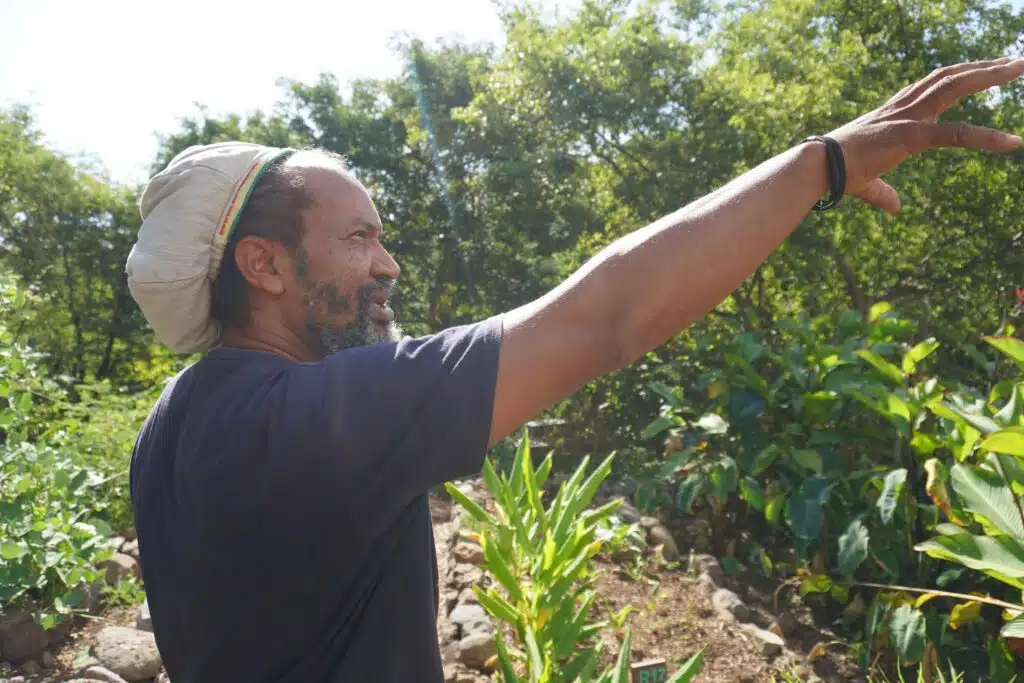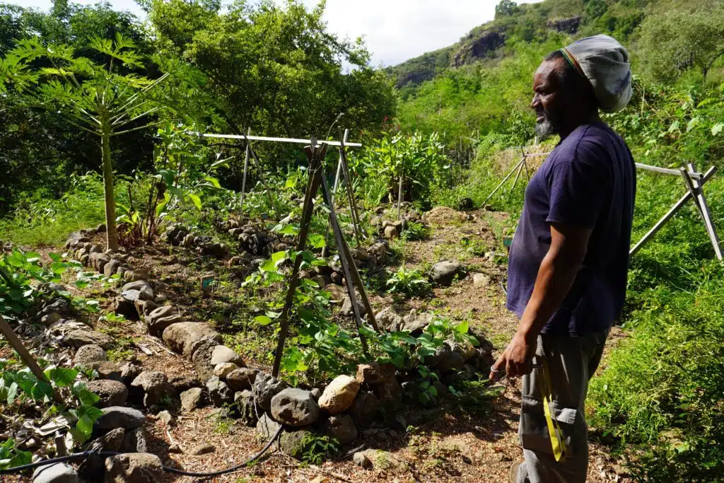 La plupart des salariés en insertion ont d’abord intégré l’équipe en tant que bénévoles. Christophe, lui, savait déjà planter lorsqu’il est arrivé sur la terre aride et rocailleuse que le département a attribué à Coralie Hoarau et surtout au projet qu’elle porte depuis bientôt une dizaine d’années. « Ma nu fèr in pé lespionaz mèm pou war si mon fason fèr té bon », s’amuse-t-il. « Ma ramèn dé trwa zafèr su mon térin : astèr mi fé in pé lazany. Mi mèt le bann fey sèk, le fey vèr, la matière organique. »