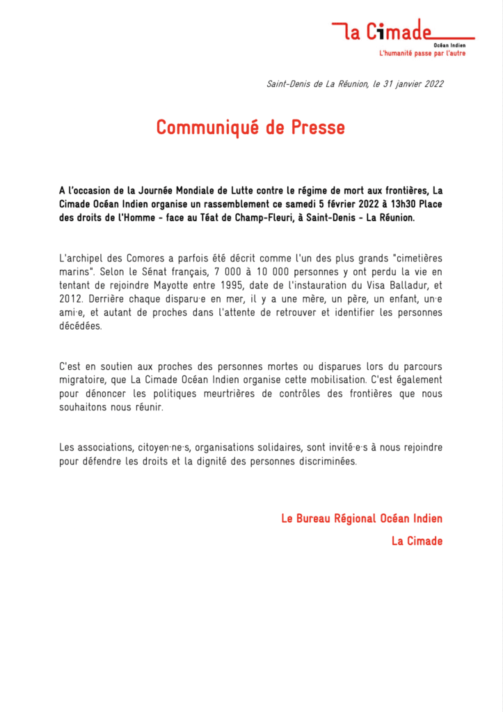 Lire également : l’appel au rassemblement ce samedi 5 février 2022 à 13h30 Place des droits de l’Homme – face au Téat de Champ-Fleuri, à Saint-Denis – La Réunion