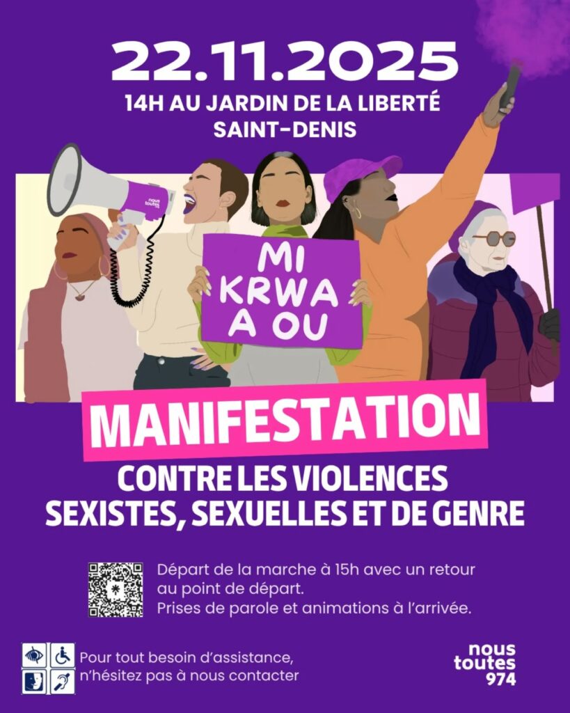 Le collectif NousToutes974 appelle à manifester ce samedi 22 novembre, à l’occasion de la journée internationale de lutte contre les violences sexistes, sexuelles et de genre. C’est dans les rues de Saint-Denis que les militant·e·s élèveront leur voix contre les féminicides, les violences patriarcales, mais aussi contre le racisme, l’impérialisme, les colonisations, les génocides et les guerres.
