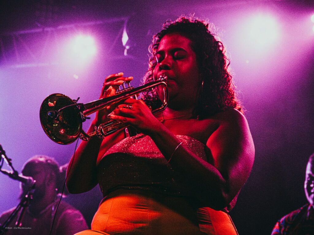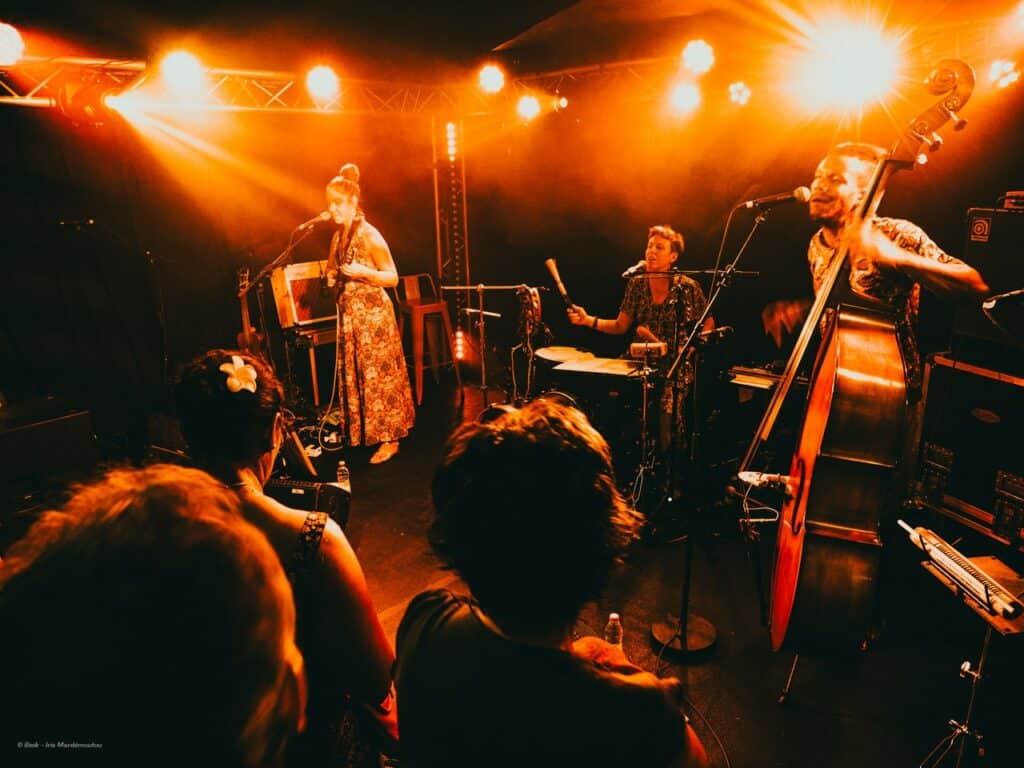 C’est à ce moment-là, sans qu’on s’y attende, que Mélanie Bourire (Kombo) rejoint la scène, apportant sa voix douce et des percussions subtiles pour “Gawé”, un titre écrit par la poétesse Barbara Robert, qui est également présente dans l’audience. Le groupe enchaîne avec “Ride” un séga joyeux et entraînant, car dans la famille Lacaille, on adore ça ! Yann-Lou se lance alors dans un solo virtuose, alternant entre trompette, contrebasse et flûte traversière, créant un véritable rassemblement de toutes les belles énergies. Quel spectacle !
