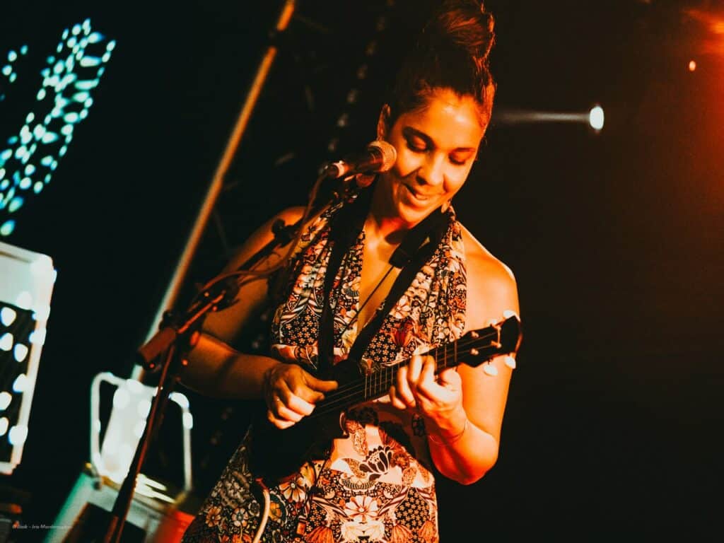 Anyel, est venue nous proposer son tout premier concert, le genre de moment suspendu dont on raffole au Bisik. Ce soir-là elle éclipse un peu son père, l’illustre Tikok Vellaye, venu accompagner sa fille à la guitare dans ce voyage merveilleux. Elle troque maintenant ses cuivres pour un ukulélé, rendant hommage à son héritage avec “Na Defwa” : elle n’oublie pas ses gramounes, et zordi elle en est très fière.