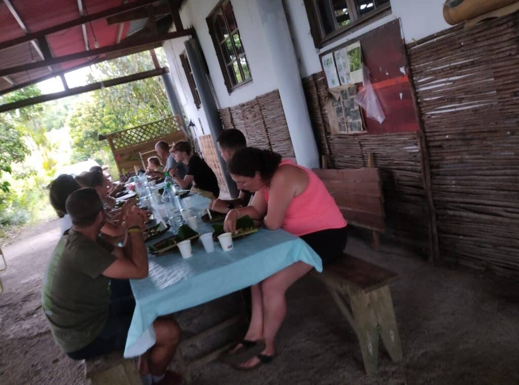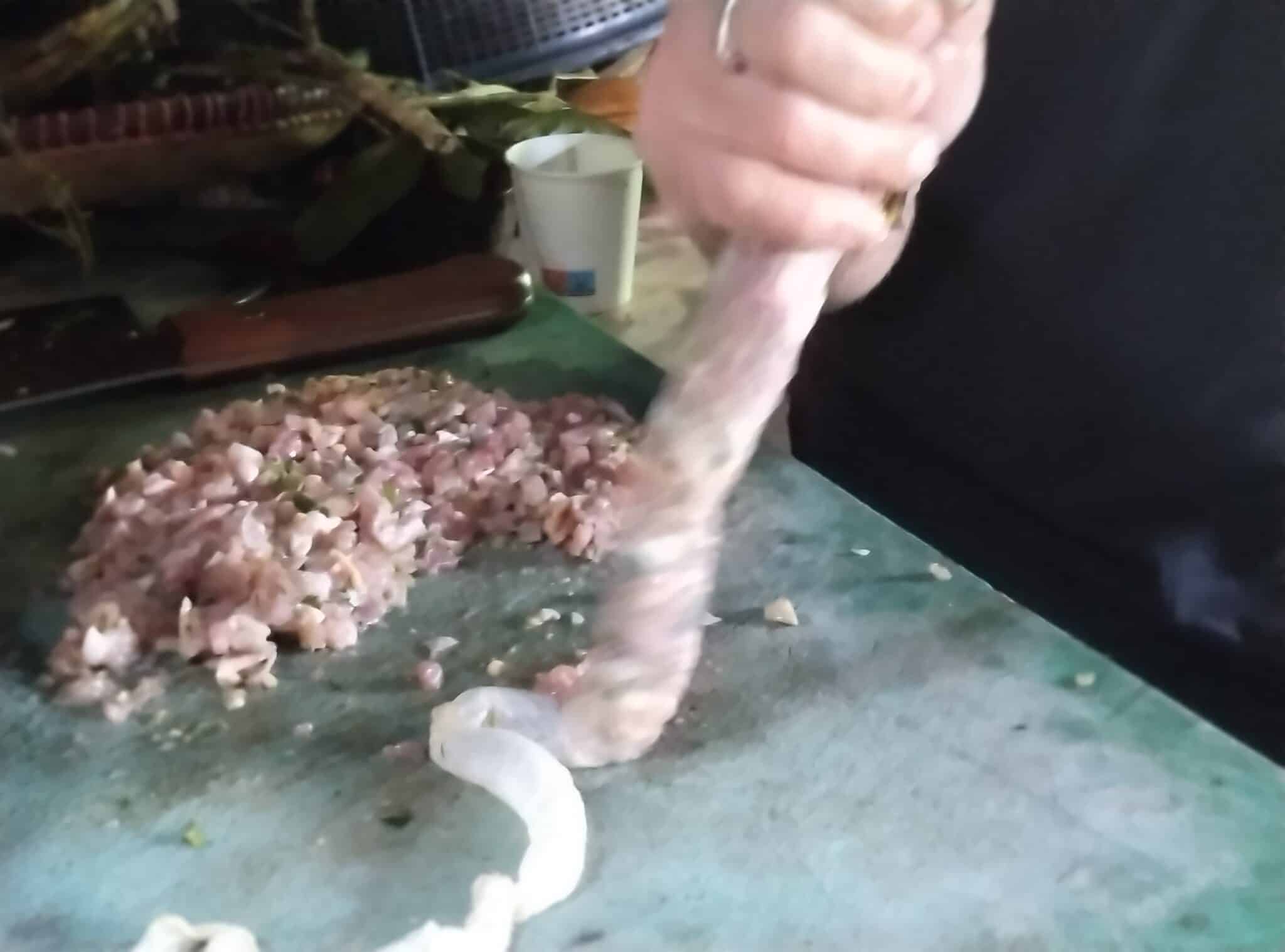 Puis beignets de capucines, saucisses du matin légèrement boucanées et rapidement cuites sur le feu, boudin, jus d’ananas frais et rhum arrangé maison à l’apéritif. En entrée, une délicieuse salade de palmistes péjibayes. Ceux-ci, récoltés sur l’exploitation pendant la visite ont l’avantage d’avoir une croissance rapide, et sont consommables au bout d’une année parfois.