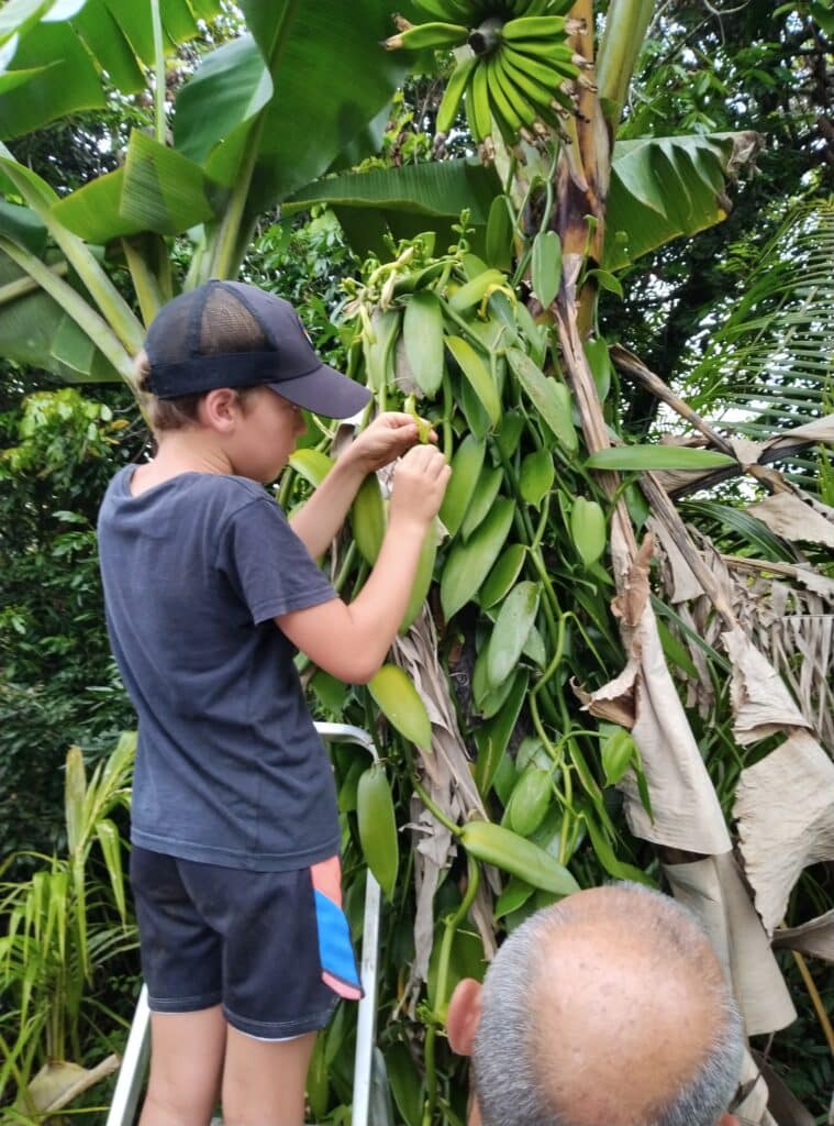 Dans les champs plusieurs cultures souvent, pour éviter que les oiseaux s’installent, dont du riz de montagne. Une filière d’avenir. Un enfant du groupe a le plaisir de s’essayer à la fécondation de la vanille.