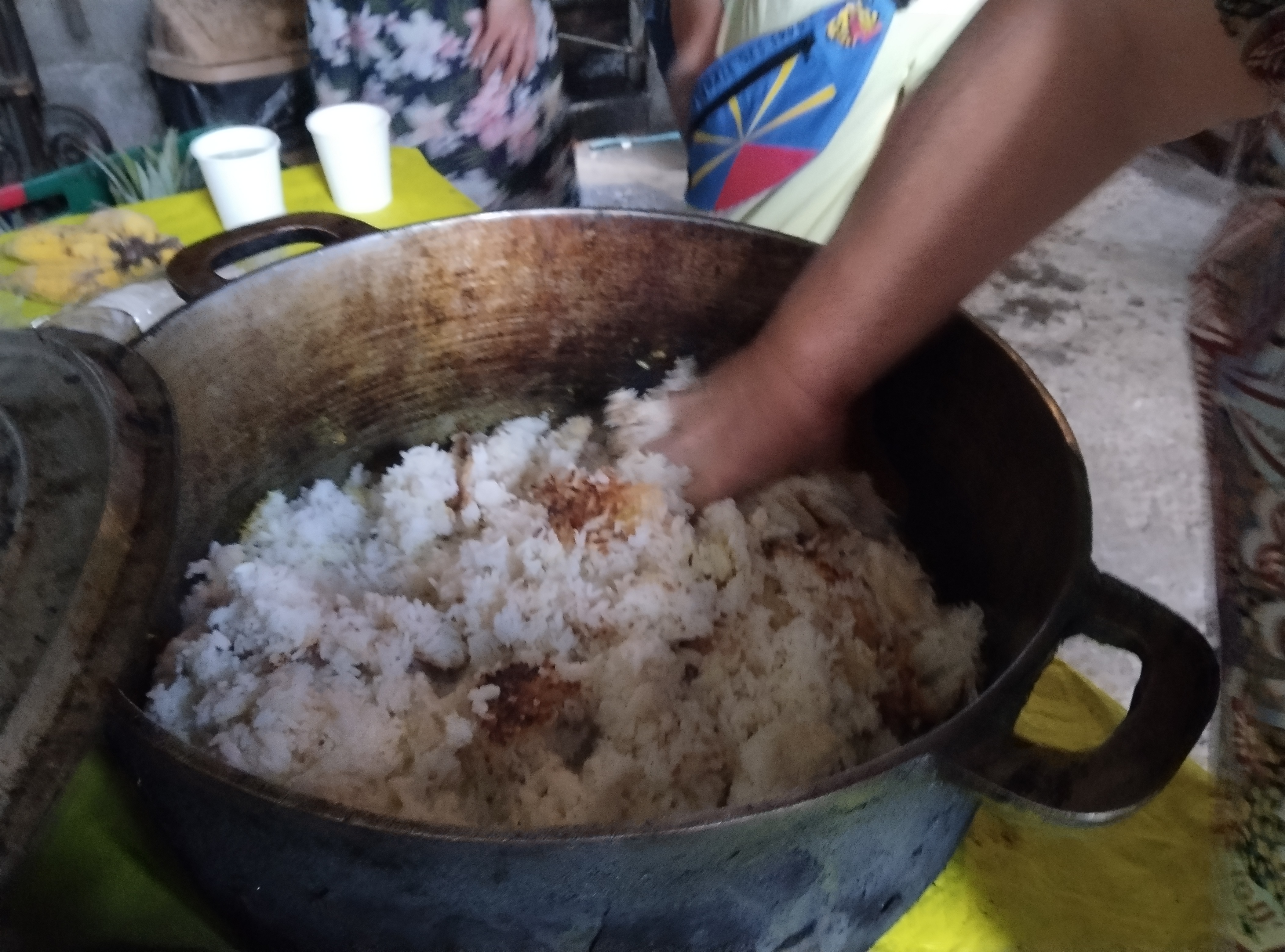 Puis rougail morue-bringelles-pommes de terre, cari de coq, riz cassé, zembrocal, rougail zévi (les rougails tomates et bringelles ont été mangés le matin dans le boucan !). Le repas se fait dans une feuille de bananier bien sûr ! Et au dessert, une originalité : le ravaz. C’est un mélange sucré cuit au feu de bois, avec manioc, patate douce et songe en particulier.
