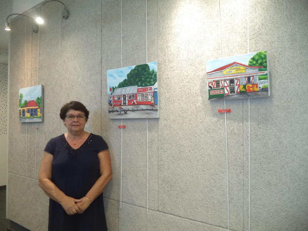 Très connue comme auteure, Sabine Thirel expose actuellement ses peintures dont de nombreux tableaux de boutiques créoles, à la Médiathèque de Saint-Joseph. Un autre talent !
