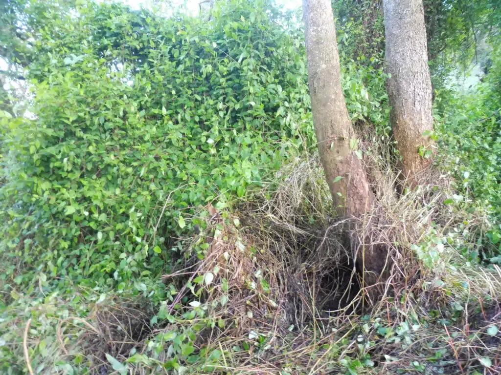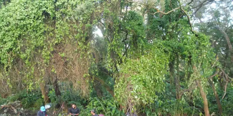 Les petits moyens mais la grande énergie de Ghislaine et de l’association scabe ont permis jusque-là de ralentir la progression de la plante. En septembre 2022, les bénévoles suspendent leurs actions, la mairie est censée prendre le relai. Quelques mois d’arrêt suffisent à faire repartir de plus belle le senecio. D’autant qu’un invité surprise s’est mêlée à l’affaire : la liane rouge, déjà présente ailleurs sur l’île, arrivée sur site en fin d’année 2022. Ghislaine a pu en faire le constat lorsqu’elle est remontée fin janvier et début février pour accompagner un groupe de lycéens. « Les deux s’entendent à merveille, ils s’aident l’un l’autre à monter sur les arbres. Deux arbres sont morts sur à peine 10m2 ! » s’inquiète Chantal. « On s’est beaucoup intéressé aux lianes mais le sol est rempli de racines partout, plus rien ne pousse ! » fait-elle remarquer.