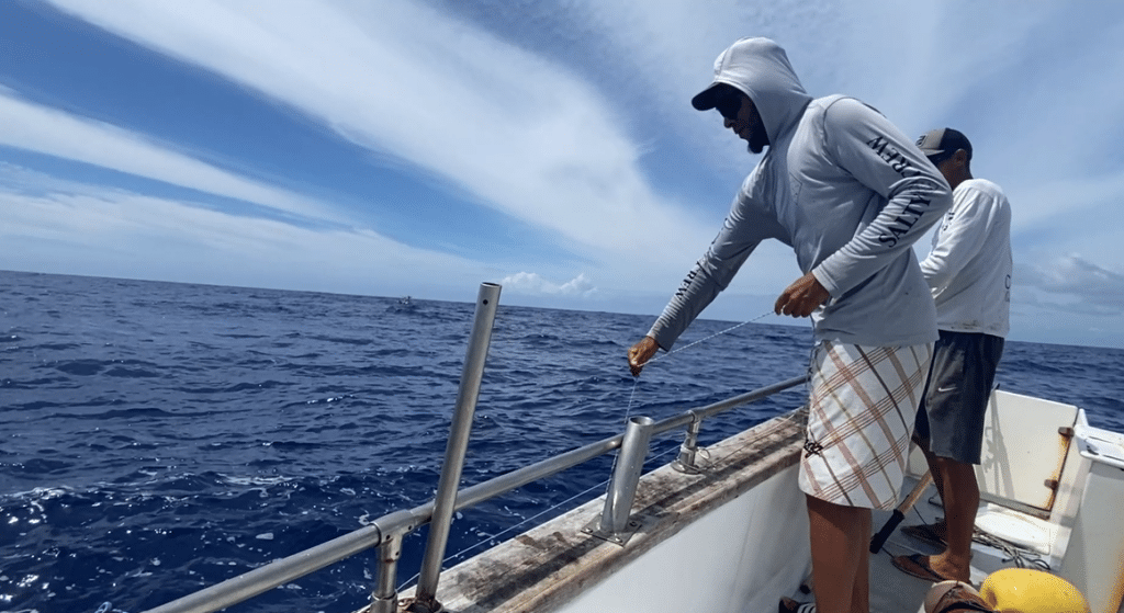 Après environ une heure de navigation, nous rejoignons le premier DCP (Dispositif de concentration de poissons). Benoit et Steven installent les cannes, puis après quelques minutes d’attente, un jeune marlin de 44 kg mord à l’hameçon. Le combat entre le pêcheur et le poisson commence. Après 45 minutes, le marlin est enfin remonté dans le bateau puis rangé dans la cale, la pêche peut continuer. Plus tard dans la matinée, Benoit et Steven passent à une autre technique, la pêche à la main et à la palangre verticale. Ils finiront la encore, par attraper un thon germon de 24 kg. Deux belles prises qui leur font dire que la pêche a été bonne.