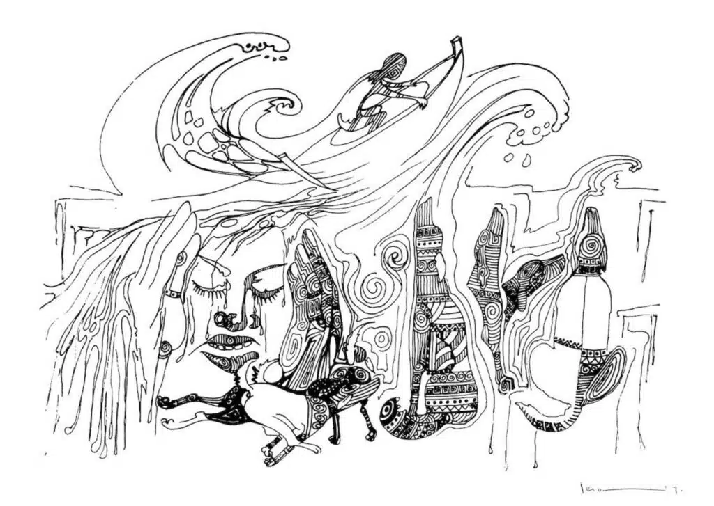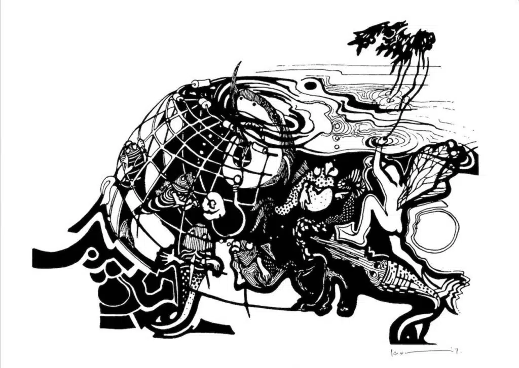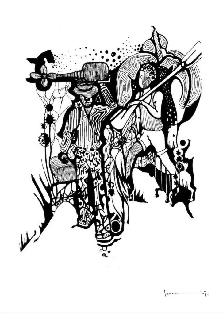 Lors de ses années d’étude aux Beaux-Arts de Toulouse, ses questionnements identitaires l’amènent à s’intéresser à l’art asiatique, il se sent attiré notamment par les œuvres d’Hokusaï. Il commence un travail en calligraphie, et, accompagné par un enseignant de l’école, il crée un genre de « hiéroglyphe Réunionnais »[10]. Son travail restera toujours influencé par cette philosophie orientale, notamment dans sa quête d’infini. Il monte un atelier de sérigraphie dans son logement d’étudiant, en pleine époque post-soixante-huitarde où les ateliers et outils traditionnels avaient été détruits dans les écoles d’art. Il développe notamment une pratique du pochoir : « j’avais, dit-il, un travail graphique forgé par les besoins d’investir la scène de la vie, notamment les rues de la cité, détournant même parfois des affiches publicitaires »