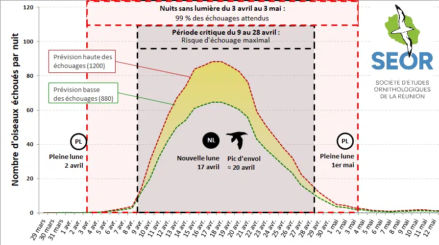 Cette année, la SEOR rappelle que la nouvelle lune est proche du pic d’envol des jeunes Pétrels de Barau. « Cela signifie que beaucoup d’entre eux n’auront pas la lune pour les guider jusqu’à l’océan et seront particulièrement désorientés par nos éclairages. Cela laisse présager que 880 à 1 200 Pétrels devraient être retrouvés échoués du 3 avril au 3 mai 2026 », annonce l’association dans un communiqué. Un chiffre qui pourrait être largement dépassé, comme ce fut le cas en avril 2024, rappelle le centre, avec 1 351 Pétrels échoués au lieu des 830 attendus.