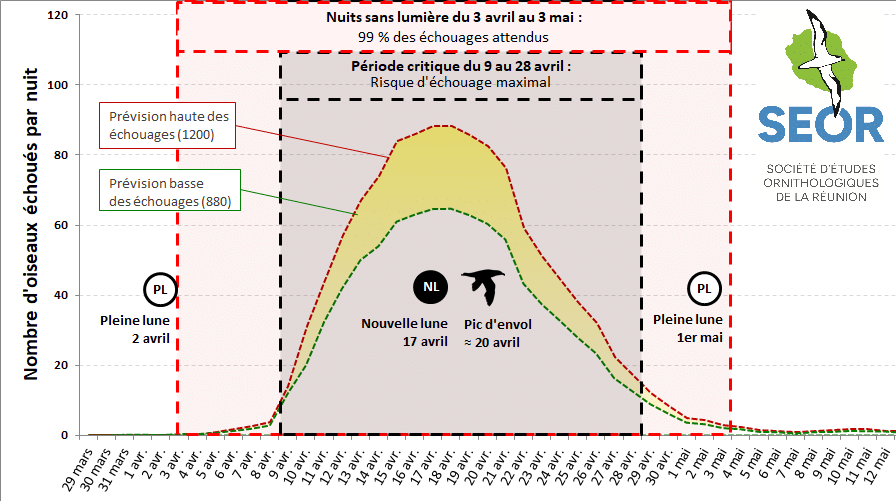Cette année, la SEOR rappelle que la nouvelle lune est proche du pic d’envol des jeunes Pétrels de Barau. « Cela signifie que beaucoup d’entre eux n’auront pas la lune pour les guider jusqu’à l’océan et seront particulièrement désorientés par nos éclairages. Cela laisse présager que 880 à 1 200 Pétrels devraient être retrouvés échoués du 3 avril au 3 mai 2026 », annonce l’association dans un communiqué. Un chiffre qui pourrait être largement dépassé, comme ce fut le cas en avril 2024, rappelle le centre, avec 1 351 Pétrels échoués au lieu des 830 attendus.