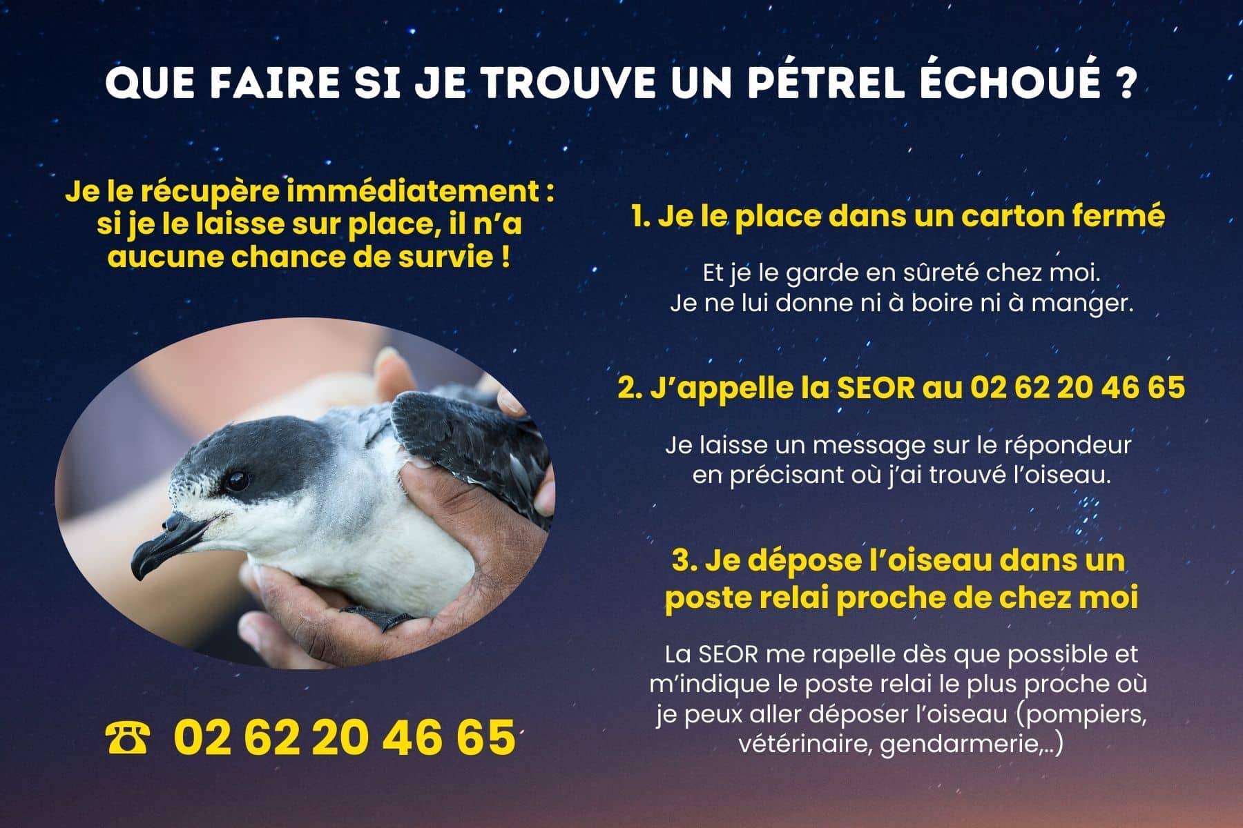 Au sein de cette campagne de sensibilisation figure également le bon comportement à adopter en cas de rencontre avec un Pétrel de Barau échoué, comme en témoigne l’infographie ci-dessous.