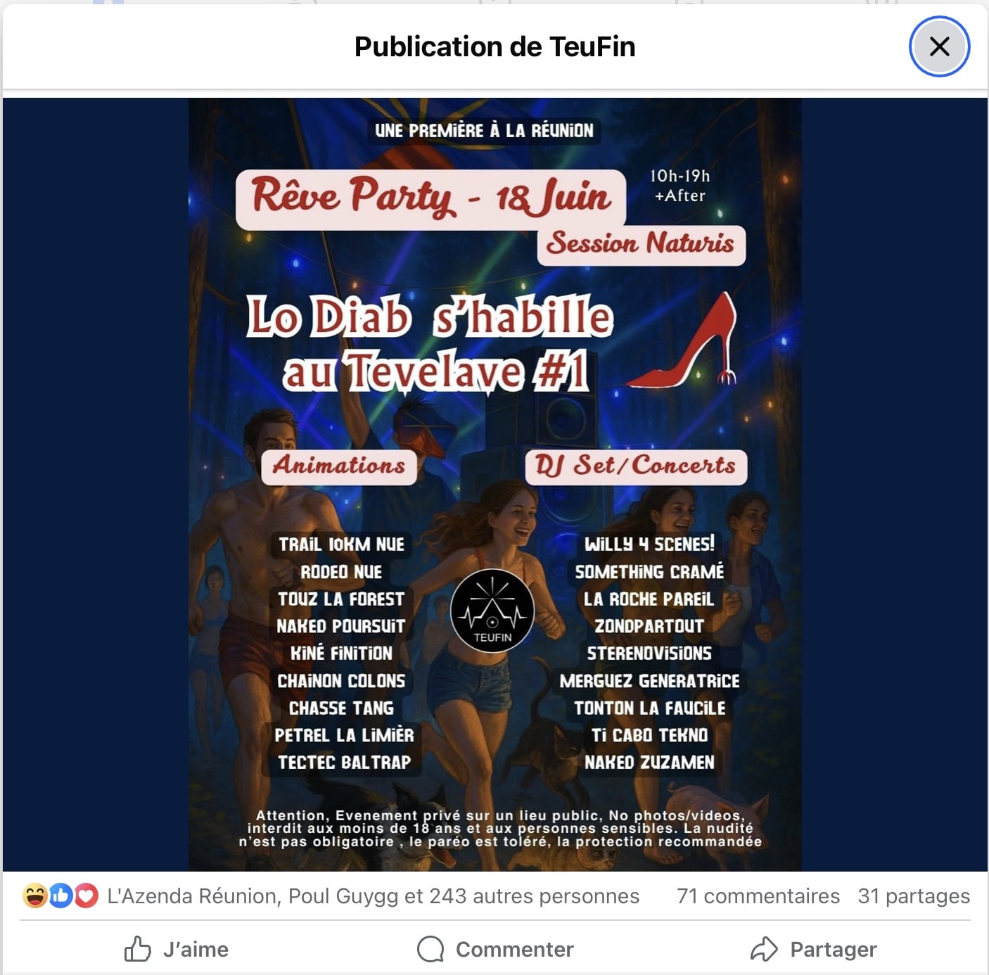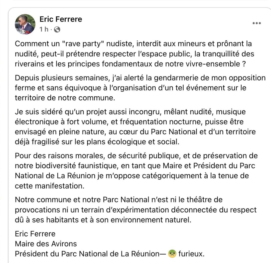 Du coup, Eric Ferrère, maire des Avirons et président du Parc national, « furieux », y va de sa demande d’interdiction alors que Freedom a retiré son post. « Depuis plusieurs semaines, j’ai alerté la gendarmerie de mon opposition ferme et sans équivoque à l’organisation d’un tel événement sur le territoire de notre commune », dit-il sur sa page Facebook au prétexte de la «morale». Les militaires en rigolent encore. Sergio Grondin, le comédien, indique pour sa part qu’il est sur place, à poil, et qu’il attend tout le monde.