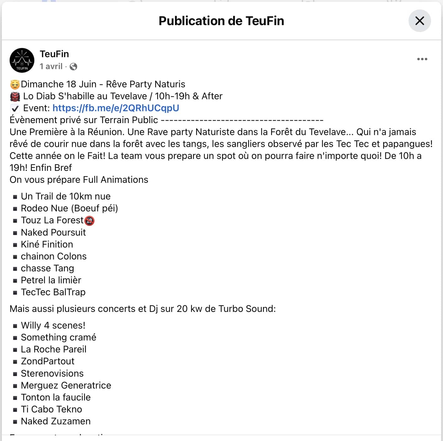 Plus c’est gros, mieux ça marche. Dans les milieux de la musique électro, la nouvelle fait glousser. La page Facebook TeuFin annonçait le 1er avril dernier l’organisation le 18 juin d’une manifestation techno naturiste au Tévelave.