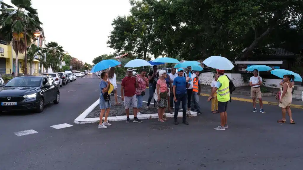 Le rendez-vous est donné à 17h30 sur la place de la mairie. Sur place, les parapluies bleus, le signe distinctif des défenseurs du domaine public maritime, sont déjà ouverts. Dominique Gamel, le président de l’association, explique que « les rondavelles doivent respecter les termes de l’AOT (autorisation d’occupation temporaire) ». « Nous avons demandé les AOT au TO (territoire de l’Ouest), sans succès.  Nous avons fait appel à la CADA (Commission d’accès aux documents administratifs) pour les AOT des dix dernières années pour voir l’évolution, nous attendons la réponse », poursuit Dominique Gamel.