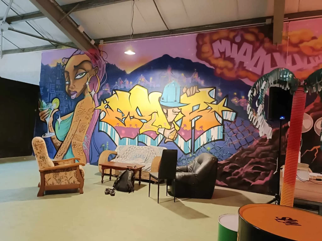 Quand on entre, ce qui frappe d’abord, c’est la déco. Les murs sont recouverts d’une fresque réalisée par des street artistes et des graffeurs. Comme le dit si bien Marie: « La première réaction des gens qui viennent pour la première fois, c’est waouh ». Je confirme ! C’est effectivement très vaste, assez insolite, et l’espace est finalement bien occupé, et bien aménagé : tables, petits salons, coin jeux vidéo, baby-foot, nombreux îlots avec des bidons peints et une scène centrale pour accueillir des groupes de musique et, enfin, un bar central et magnifiquement décoré. « On a aménagé essentiellement avec du matériel de récupération, des achats chez Emmaüs, et divers éléments bricolés, parce qu’il a fallu au maximum rentrer dans notre budget ». Les chaises fabriquées avec des planches de skate valent le détour !