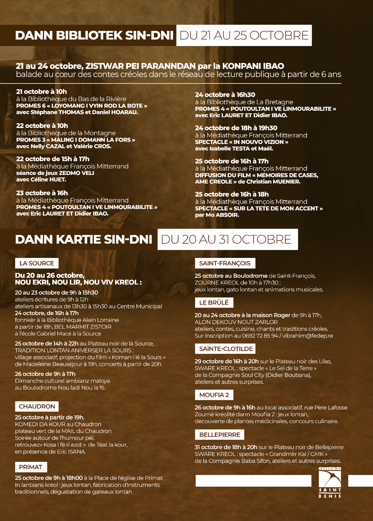 Sous le signe du partage et de la transmission, la Ville de Saint-Denis propose de son côté une dizaine de jours d’animations dans tous les quartiers : spectacles, ateliers, projections, fonnkèr, jeux lontan et soirées populaires. Huit compagnies de l’île — Didier Ibao, Didier Boutiana, Vincent Fontano, Éric Isana, Baba Sifon, Mo Absor, Isabelle Testa et Céline Huet — se réunissent pour faire vibrer la capitale au son des mots, de la musique et des traditions lontan.